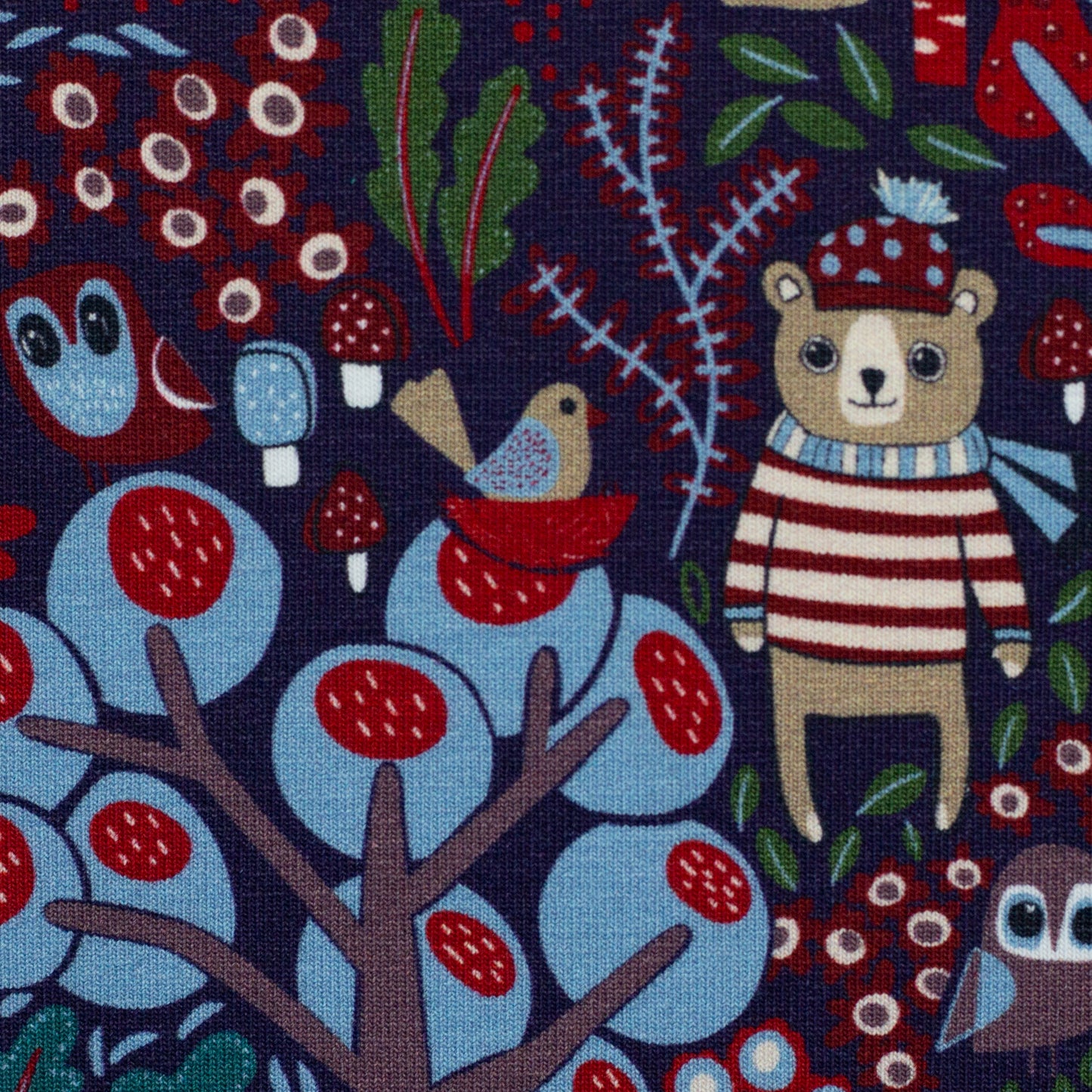 Into the woods - French Terry Stof. Een fijne french terry stof met een bos tafereel erop dat doet denken aan de herfst/winter. De ondergrond is heel donkerpaars van kleur. Met bepaald licht lijkt hij donkerblauw.