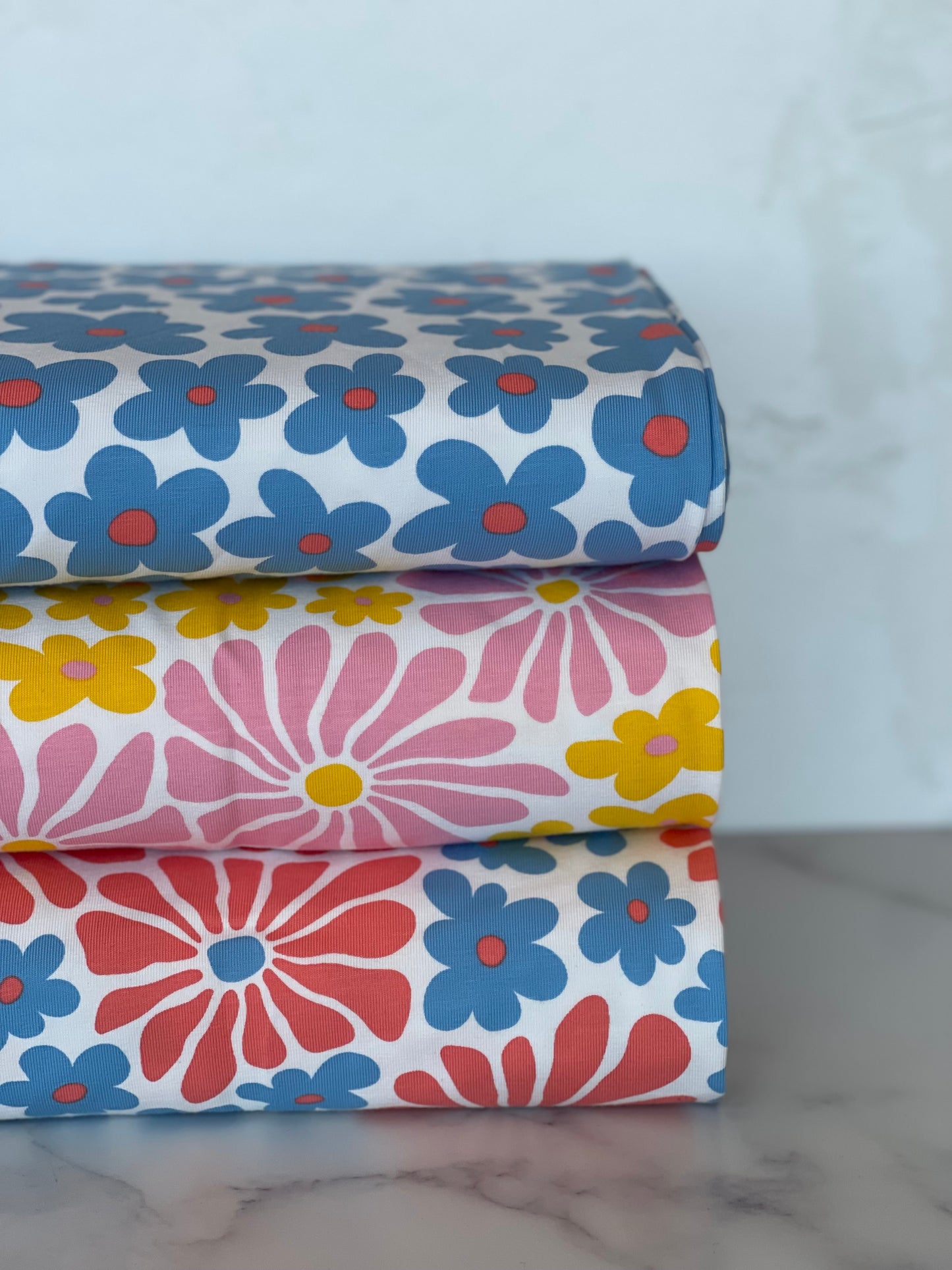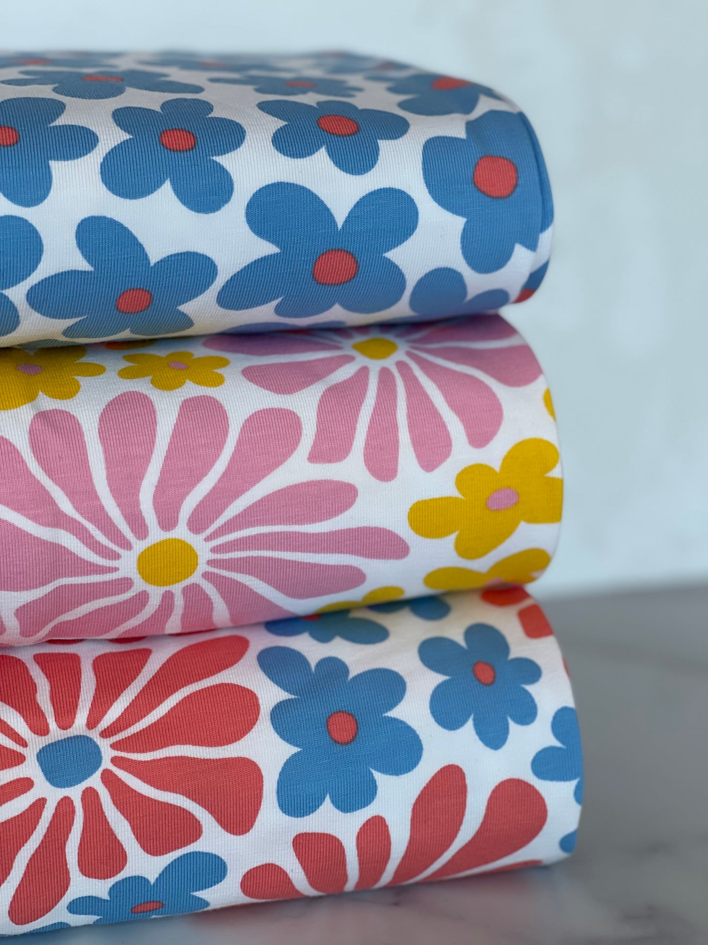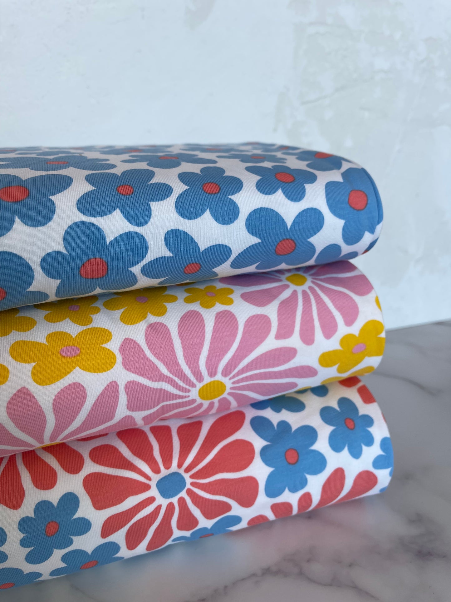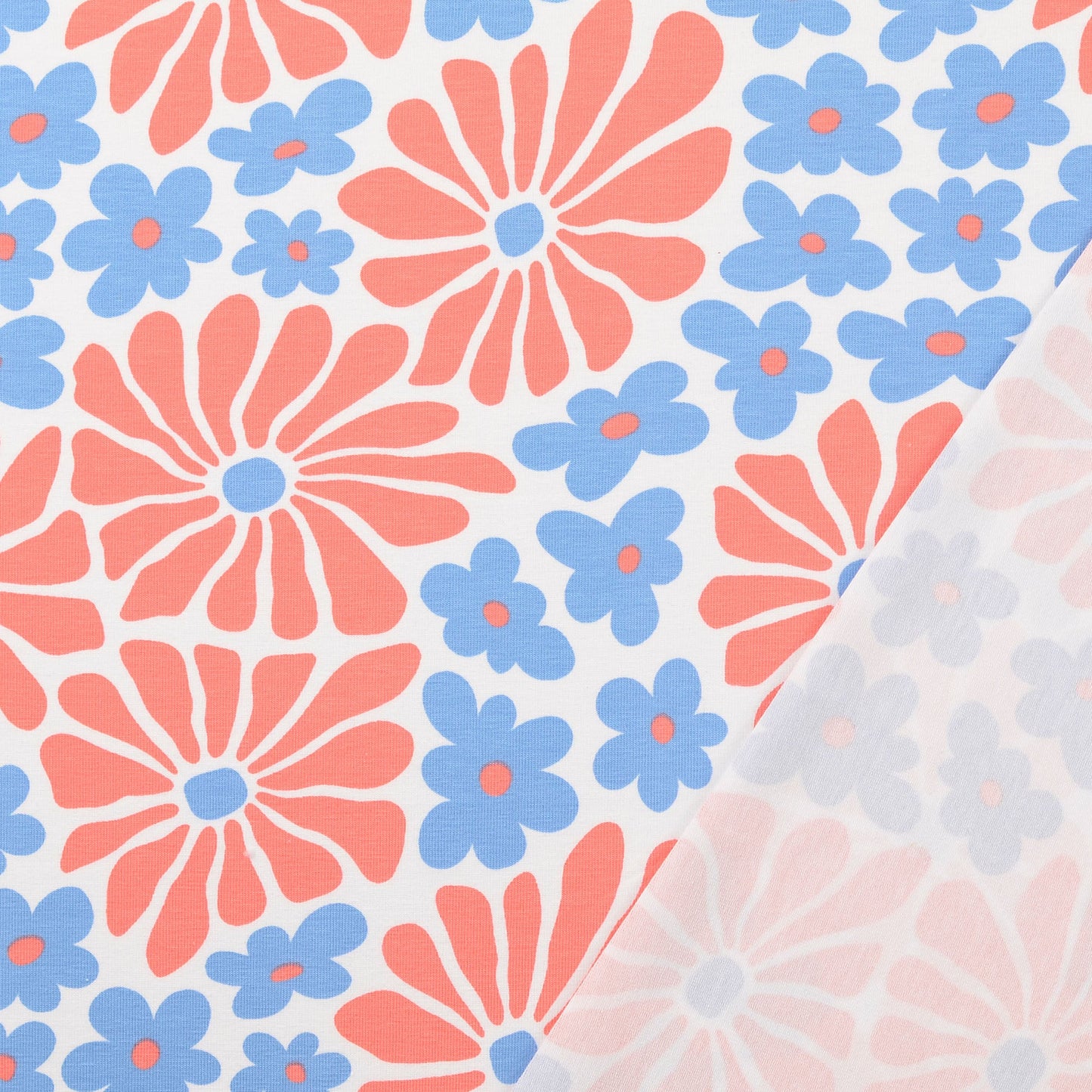 Matisse Flowers Katoen Jersey - Wit blauw koraal.
