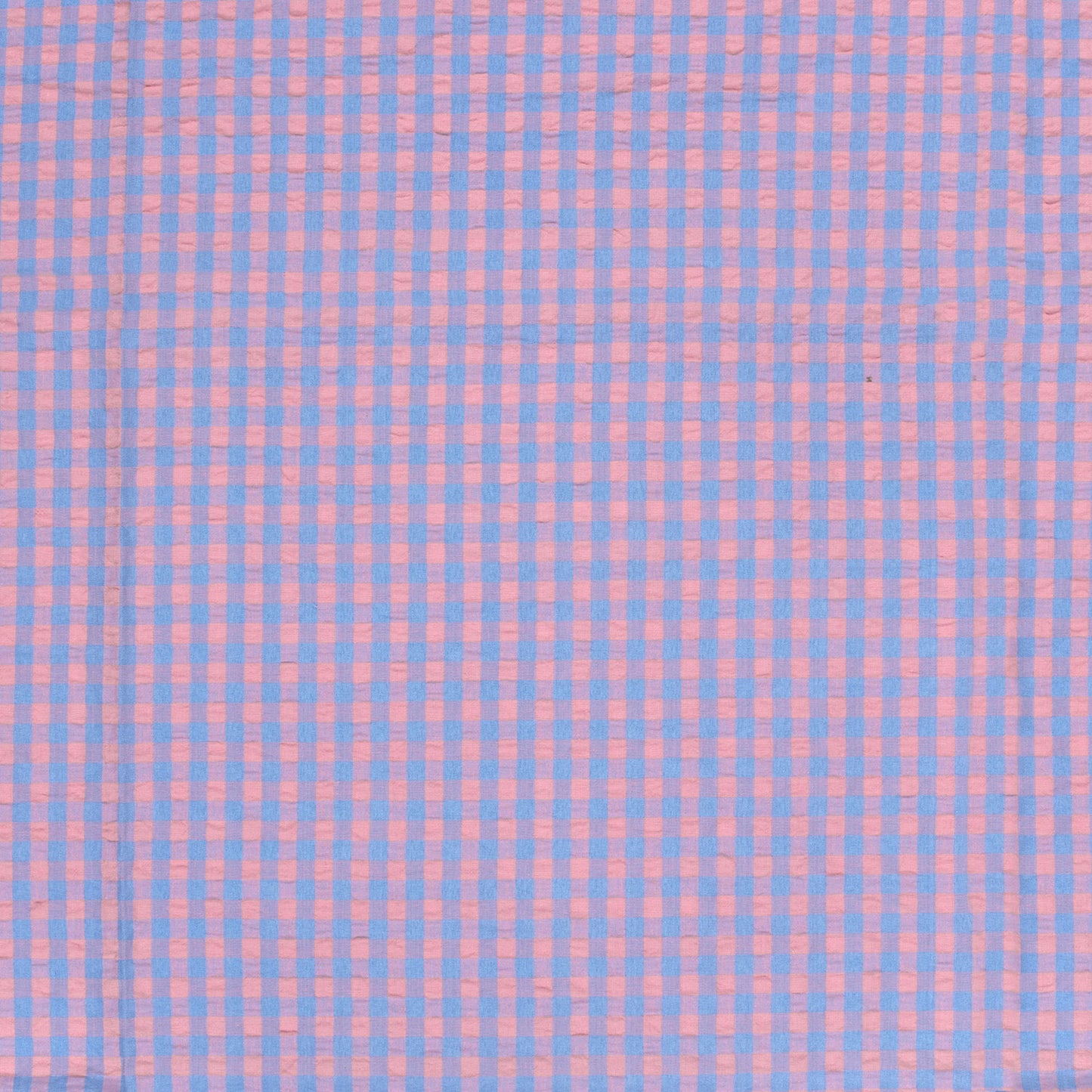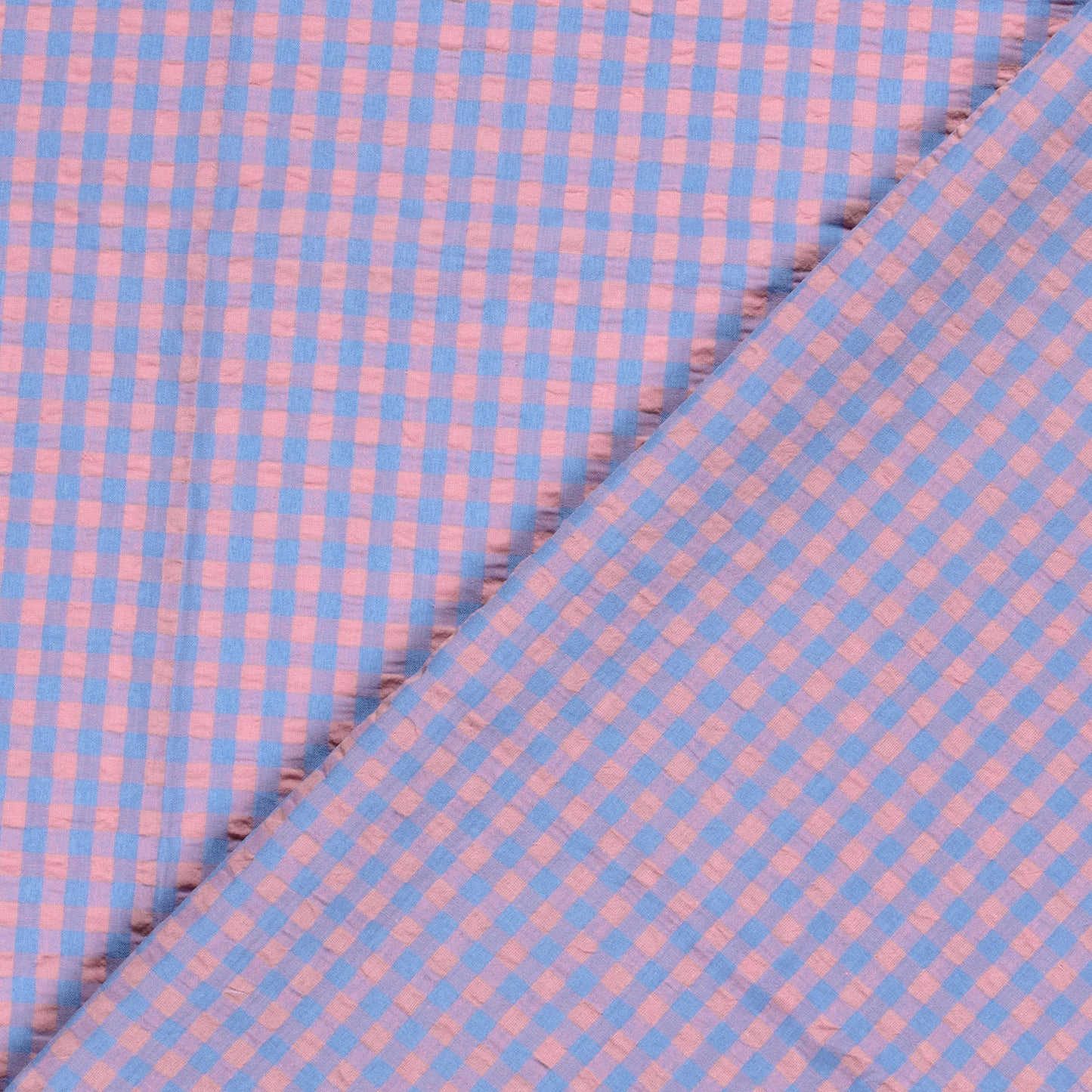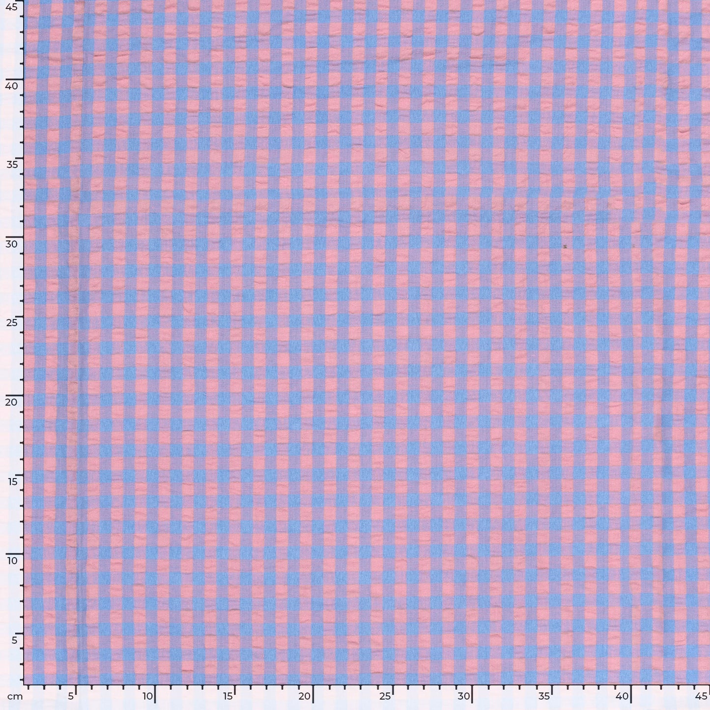 Seersucker Ruit Katoen - Lichtblauw Lichtroze. Een soepele seersucker in een mix van katoen en een klein beetje polyester voor het kleurbehoud in de stof.