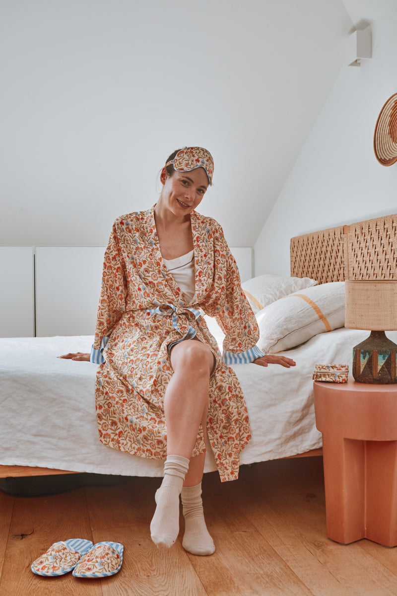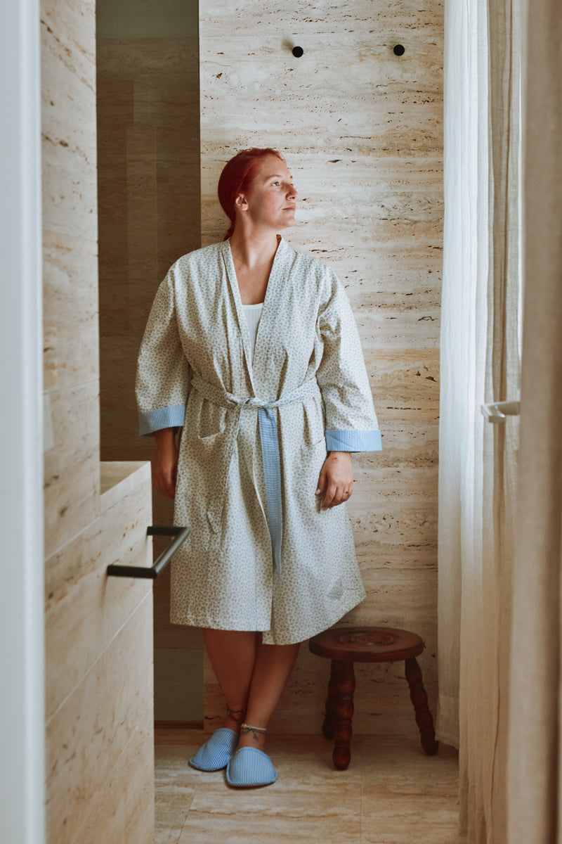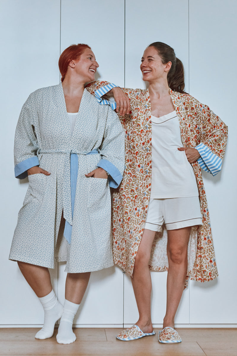 Alexandrie is a set of four patterns designed around the bedroom, for women and men: a kimono, slippers, a sleep mask and a jewelry box. The finishes are meticulous (French seams, flat felled seams, trimmed, and piped) for a refined result.
