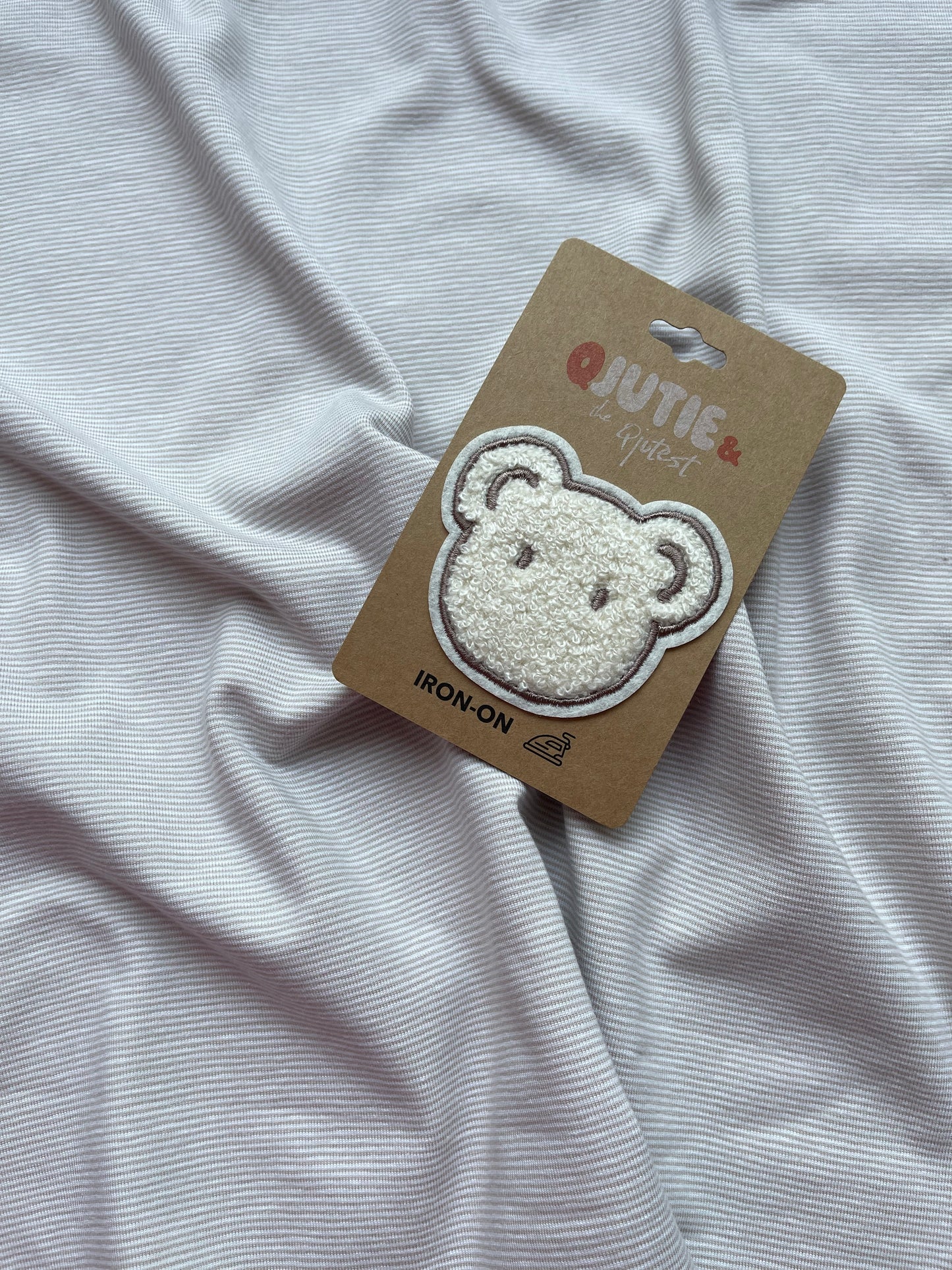 Beertje Strijkapplicatie - Qjutie and the Qjutest. Maak je outfit compleet met deze Beertjes strijkapplicatie. Past erg leuk bij de doorgestikte beren stof, de fleece stof met zelfde beren opdruk op de streepjes jersey.