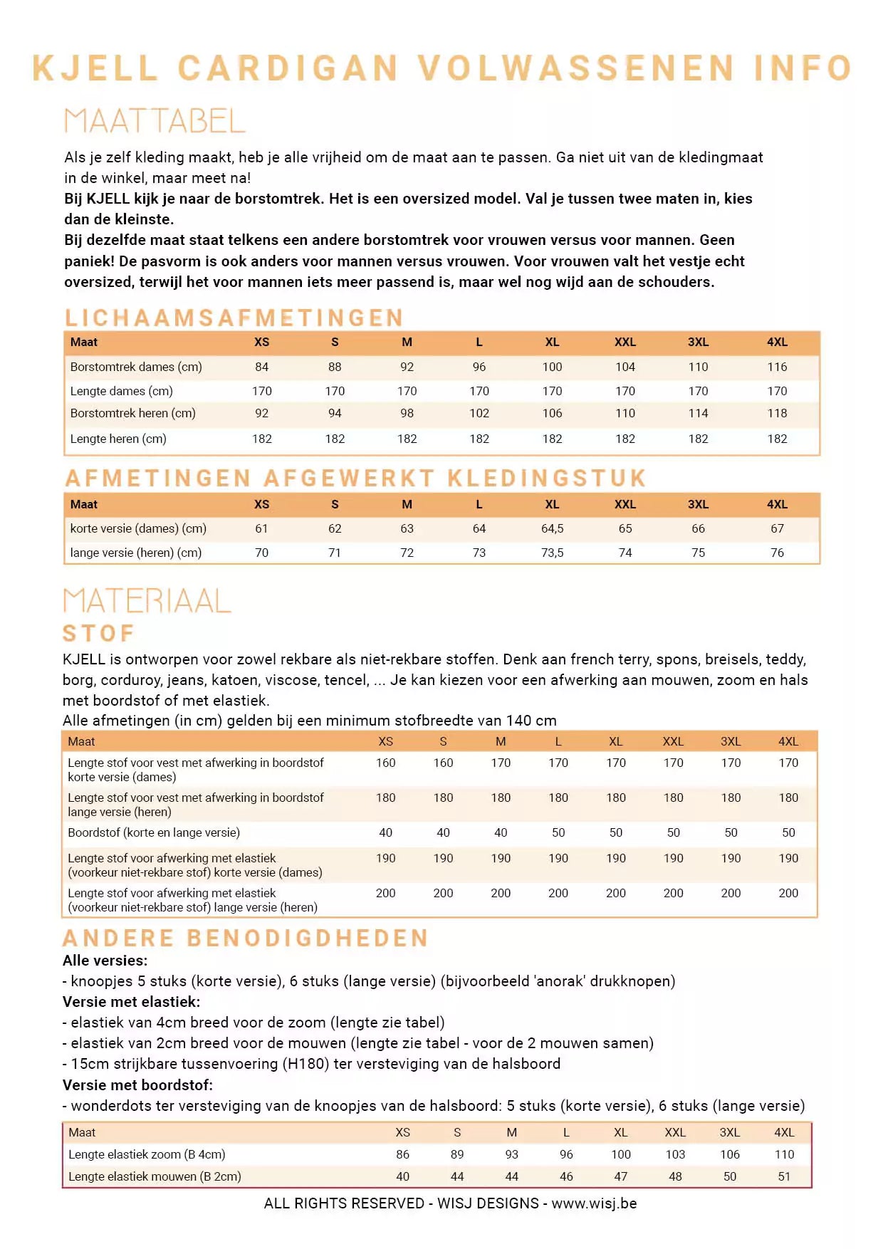Kjell is een wijde, stoere, boxy cardigan in maten XS tot 4XL. Het is een unisex naaipatroon waarbij er een andere borstomtrek per maat aangegeven staat voor mannen en vrouwen. Kjell is een allround vestje met uitgesneden hals, knoopjes, zakken en een rugpas. Kjell is ontworpen voor zowel rekbare als niet-rekbare stoffen. Denk aan french terry, spons, breisels, teddy, borg, corduroy, jeans, katoen, viscose, tencel, … Maak hem met boordstof aan polsen, hals en zoom waardoor het aanleunt bij een trui. Of kies voor een versie met elastiek in de zoomboord en aan de polsen en halsboord uit dezelfde stof als het vestje zelf waardoor Kjell de uitstraling van een stoer jasje krijgt.