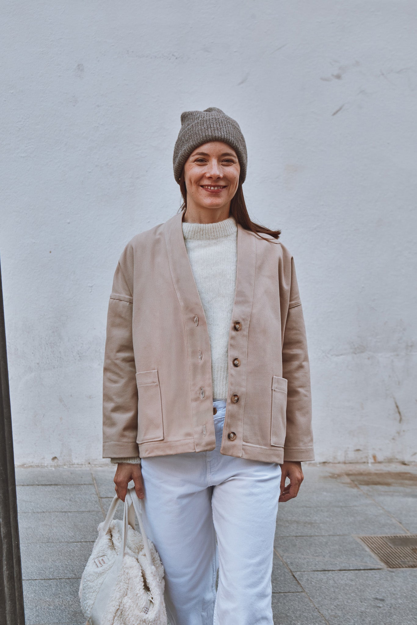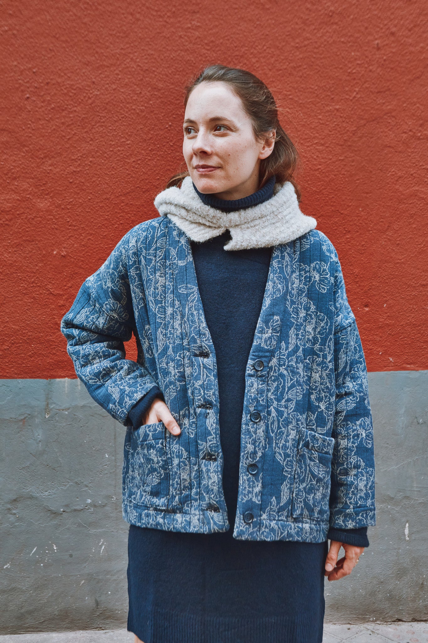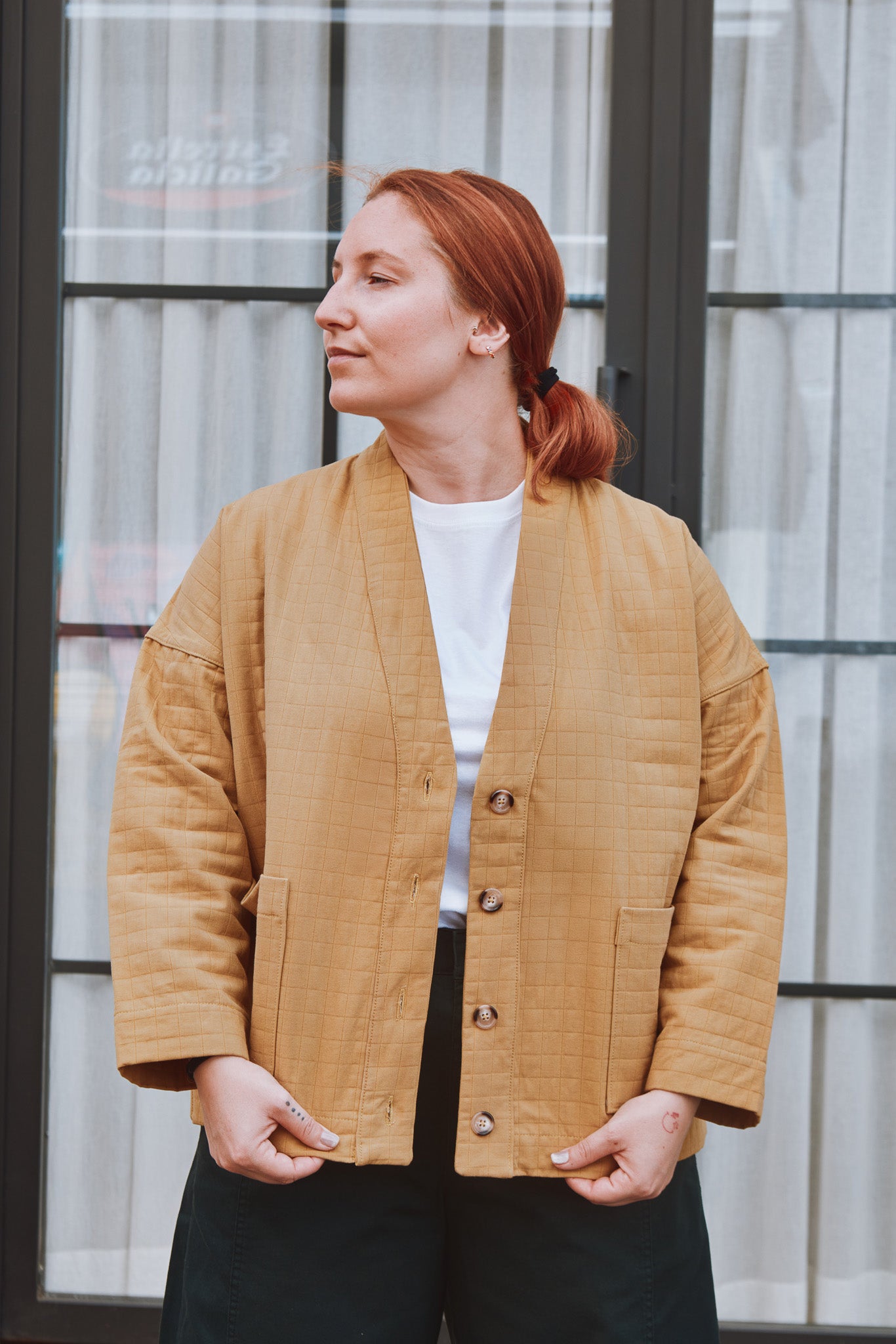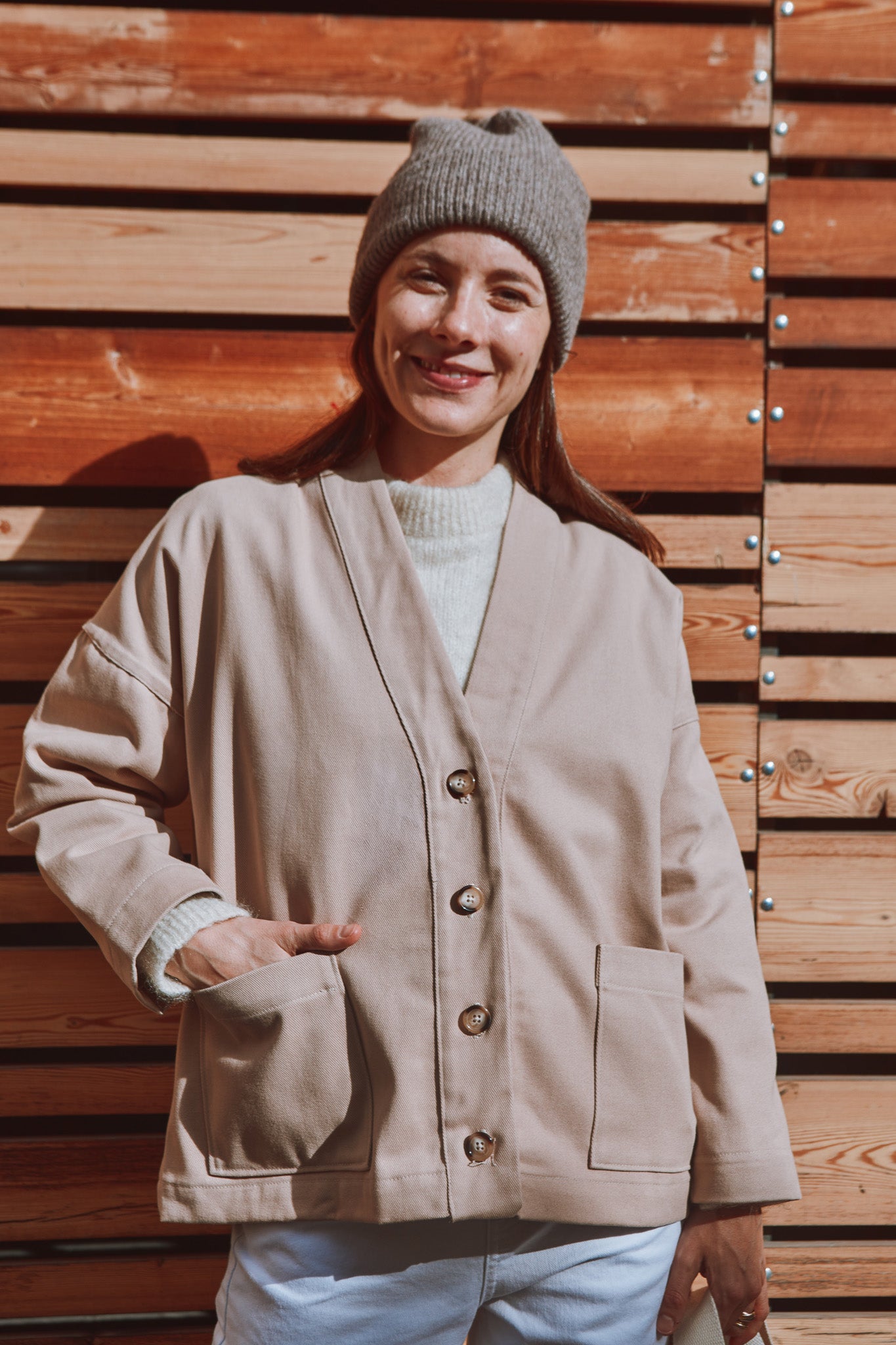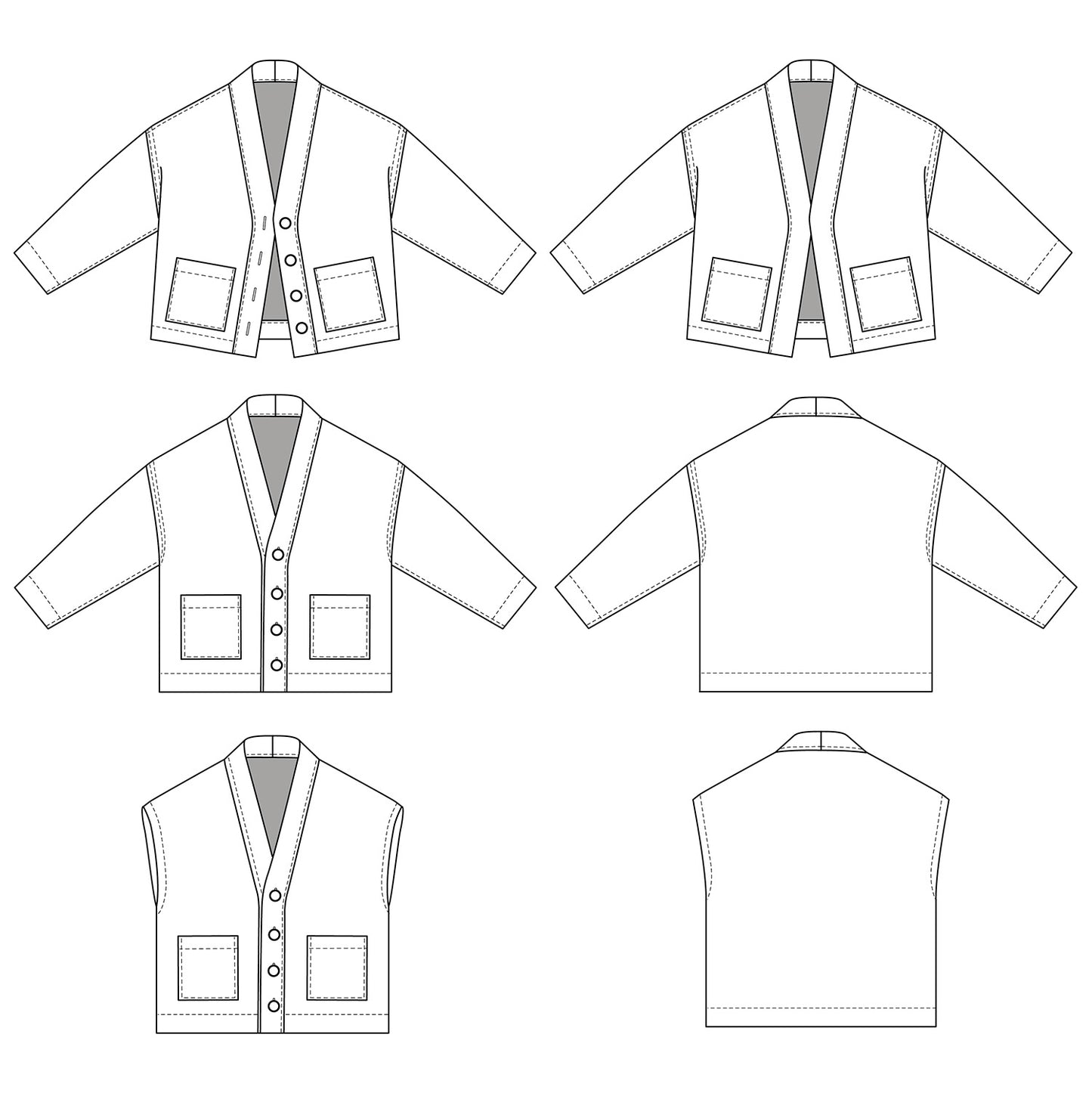 Macao is a jacket or cardigan pattern with loose fit and dropped shoulders. It offers a choice of long sleeves or sleeveless. A shaped, lined neckline band gives structure to the garment. Flat-felled seams ensure a strong and impeccable finish.