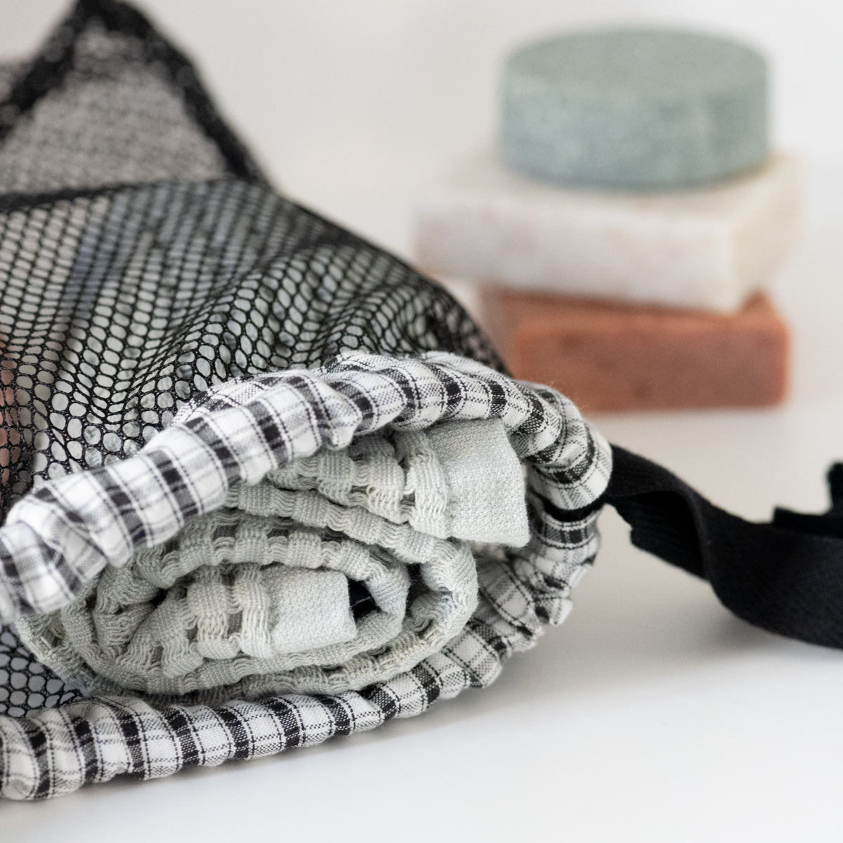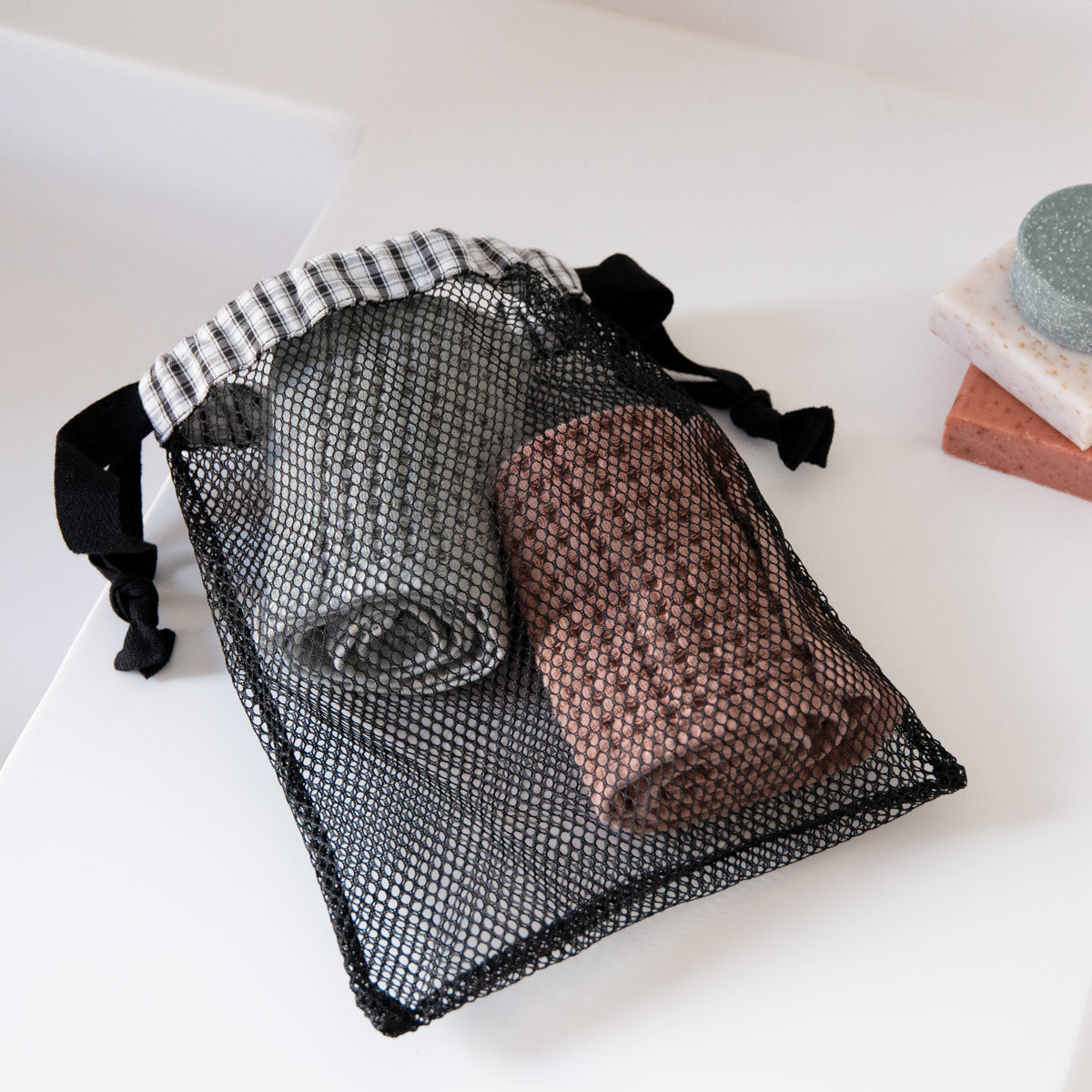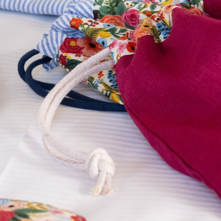 Three sizes of drawstring pouches with cord closures and French seams. Perfect for beauty and hygiene products, organizing a wardrobe or suitcase. Made of mesh, they can also be used for machine-washing lingerie.