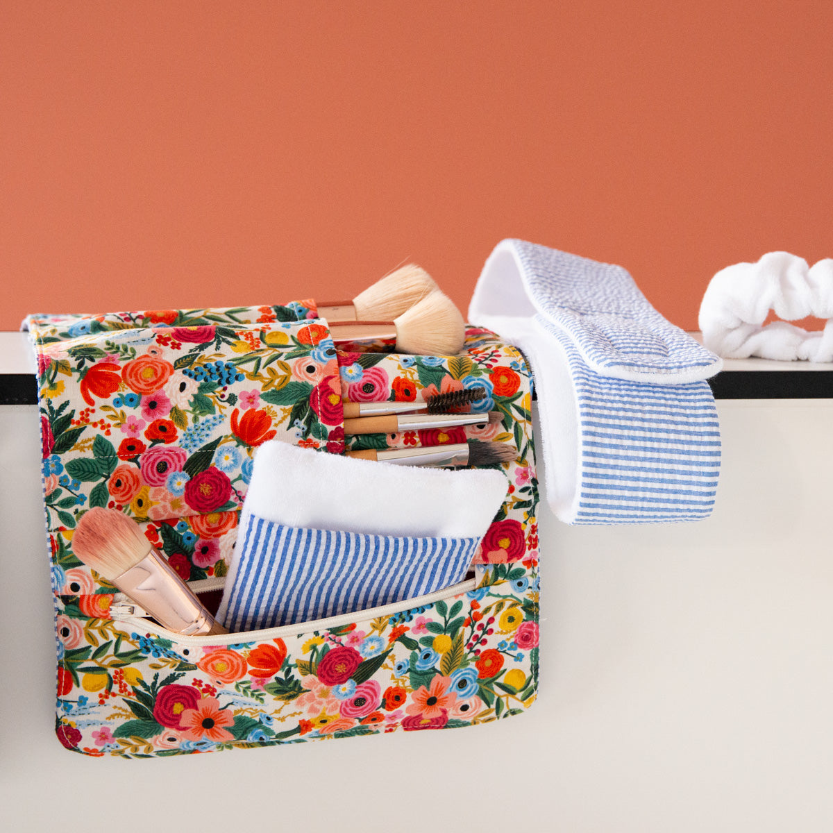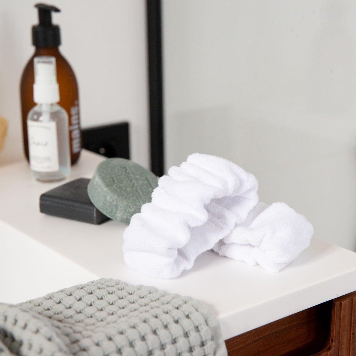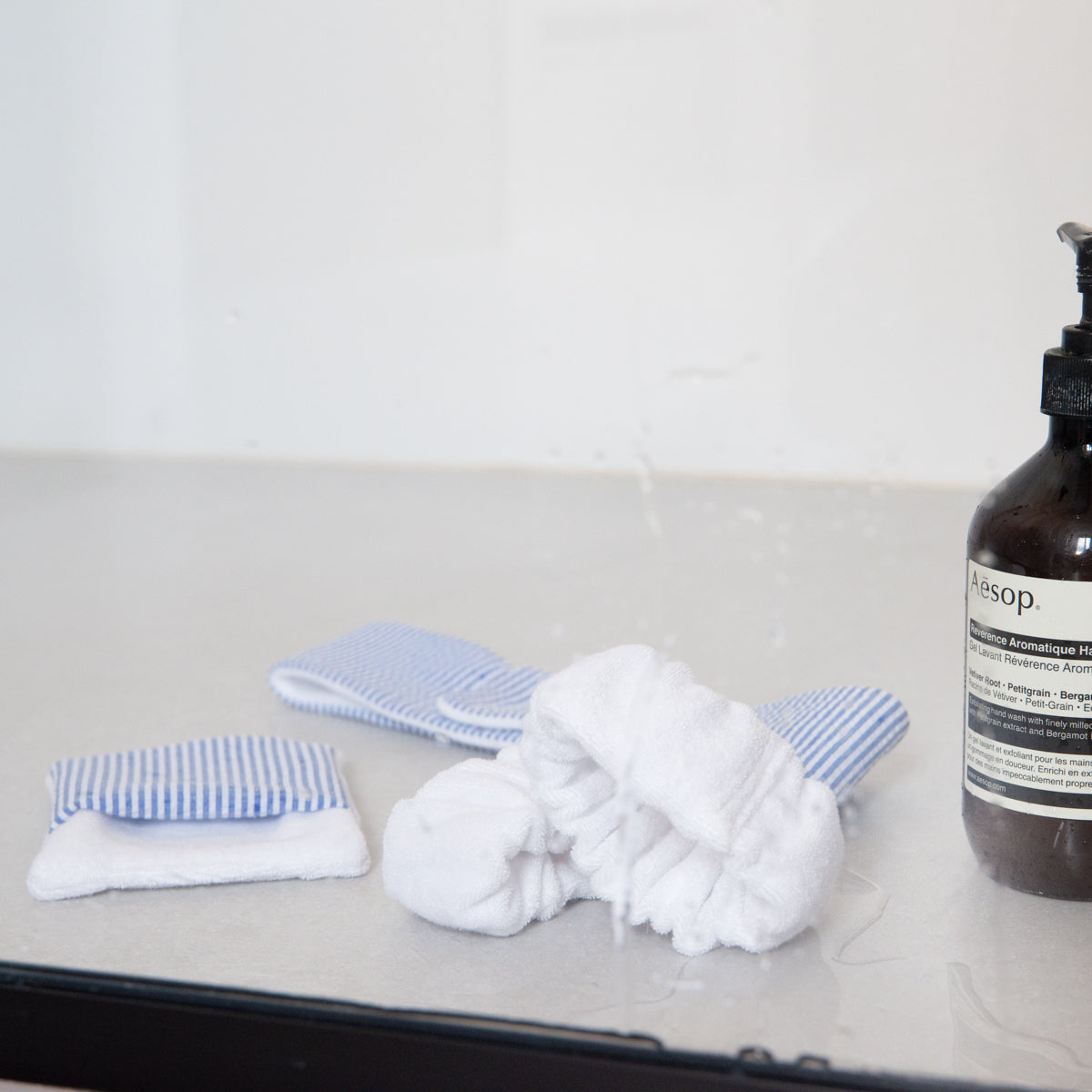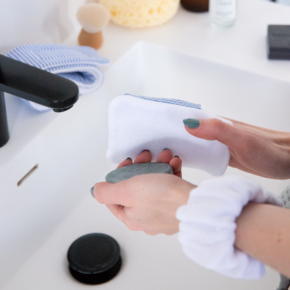 Headband and wristbands for skincare, along with a face pad and soap pouch—quick and easy to sew, featuring an absorbent fabric like terry cloth.