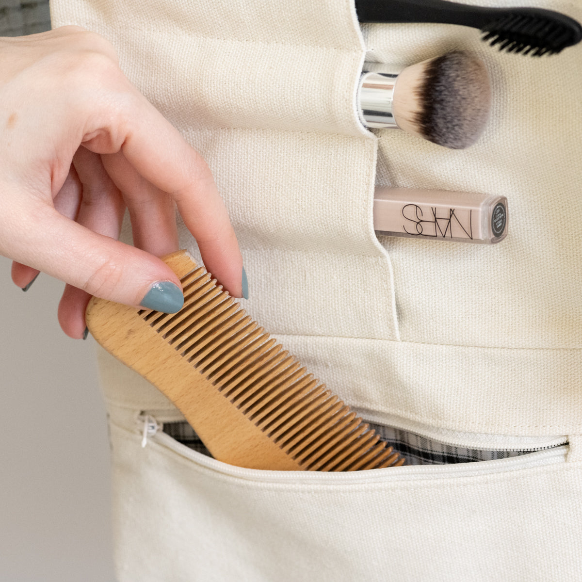 A compact, versatile nomad case for multiple uses: toiletry bag, makeup case, manicure kit, knitting needle organizer, or pencil case. It includes zipped pockets and compartments, folds into three sections, closes with ties or a button, and can be hung up.