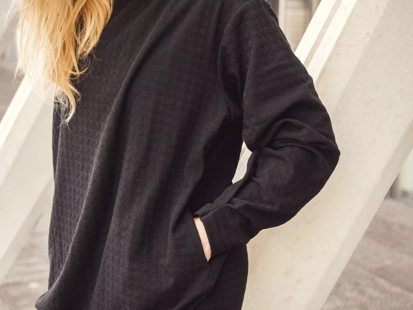 Rafi is ontworpen voor rekbare stoffen. Denk aan tricot, french terry, rekbare gebreide stoffen, spons, .. Afwerken aan de hals en armen kan met dezelfde stof of met boordstof.