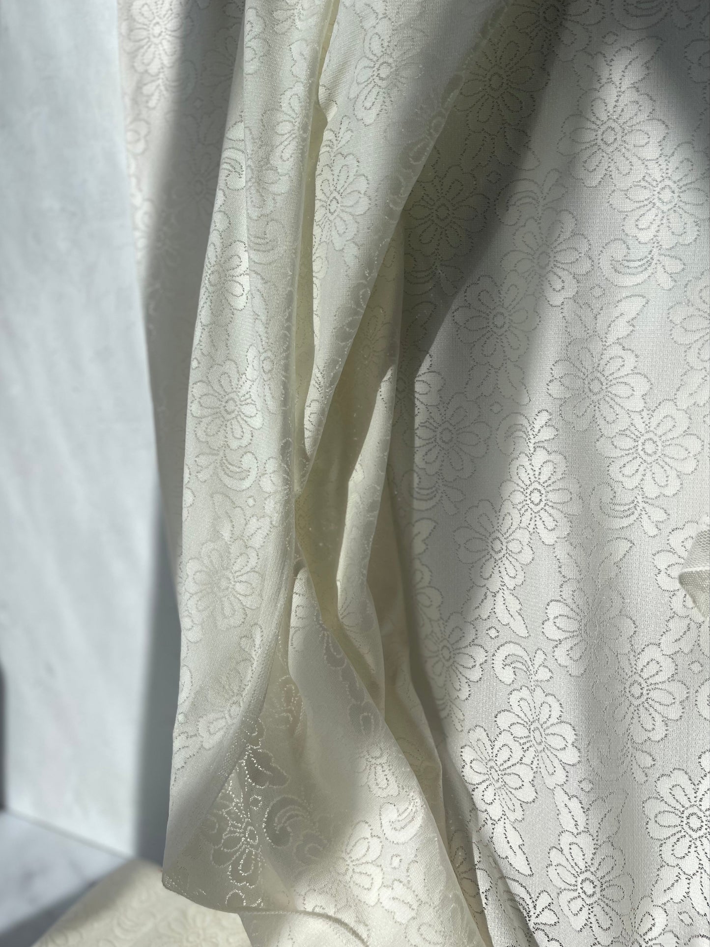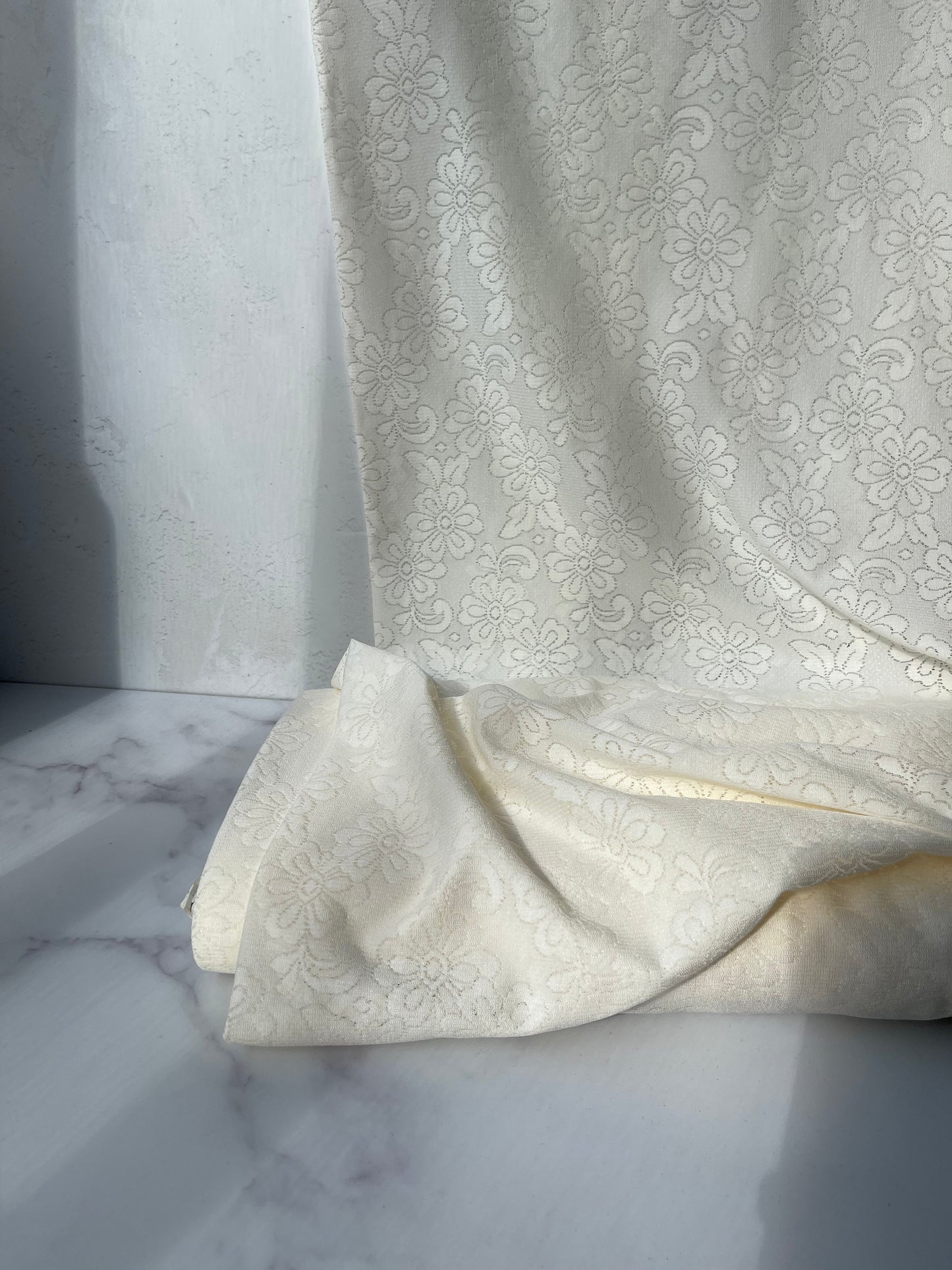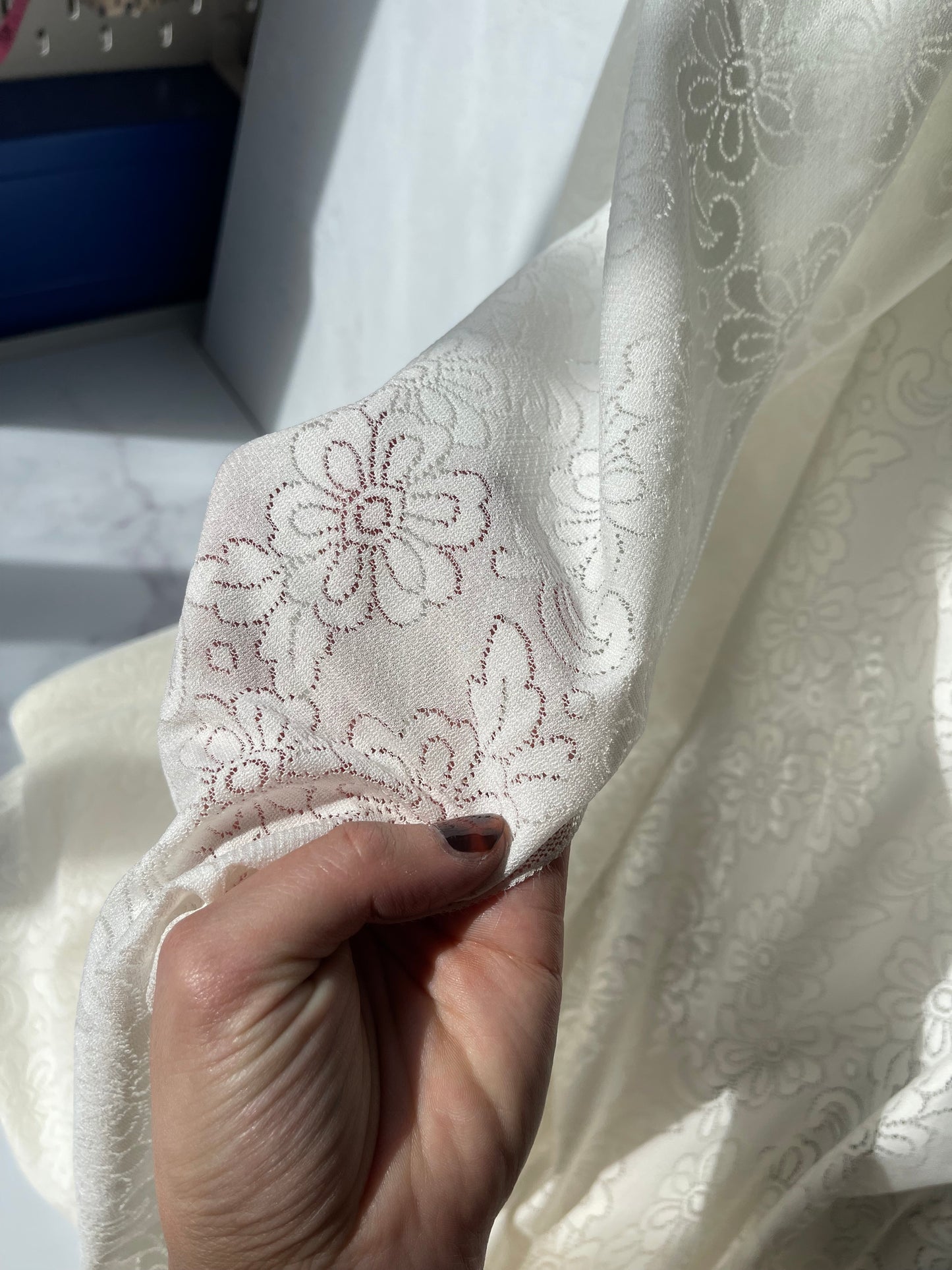 Vintage flowers Gebroken wit - Deadstock. Een zachte en soepele deadstock stof. De kleur is gebroken wit, zo'n typische vintage kleur. Er zijn bloemen in de stof geweven en de stof is semi transparant.