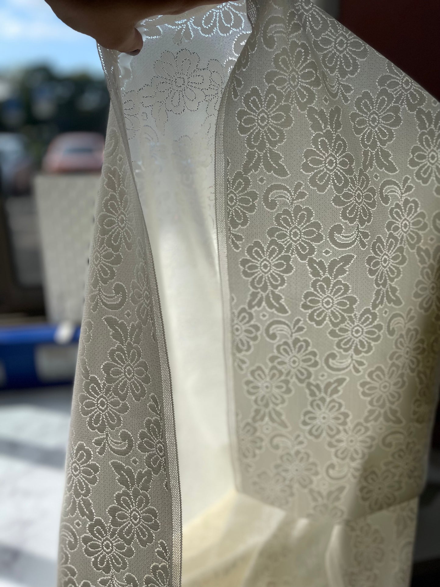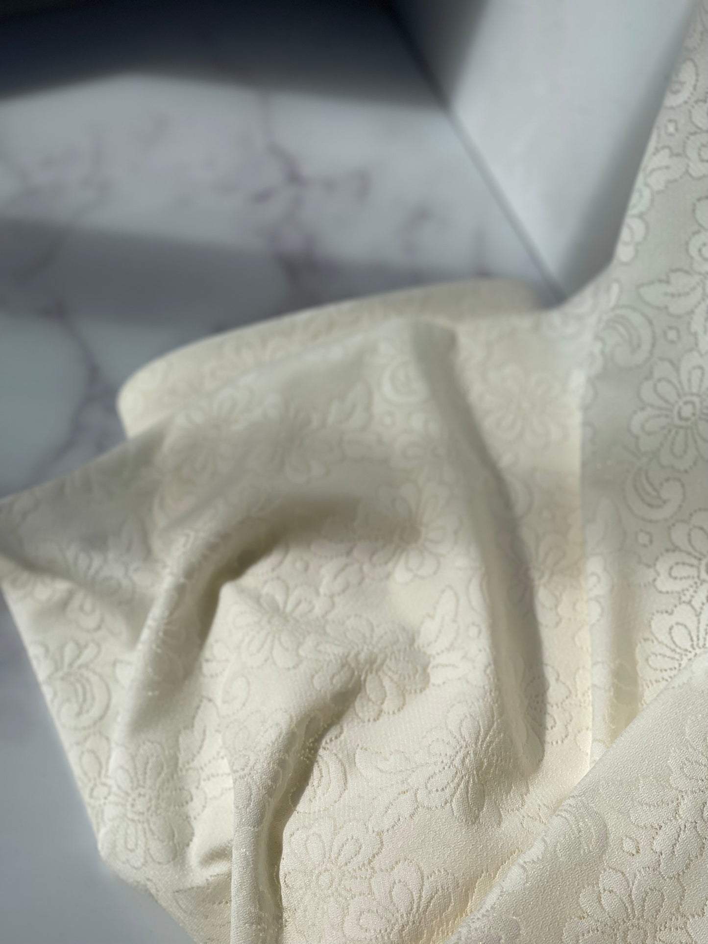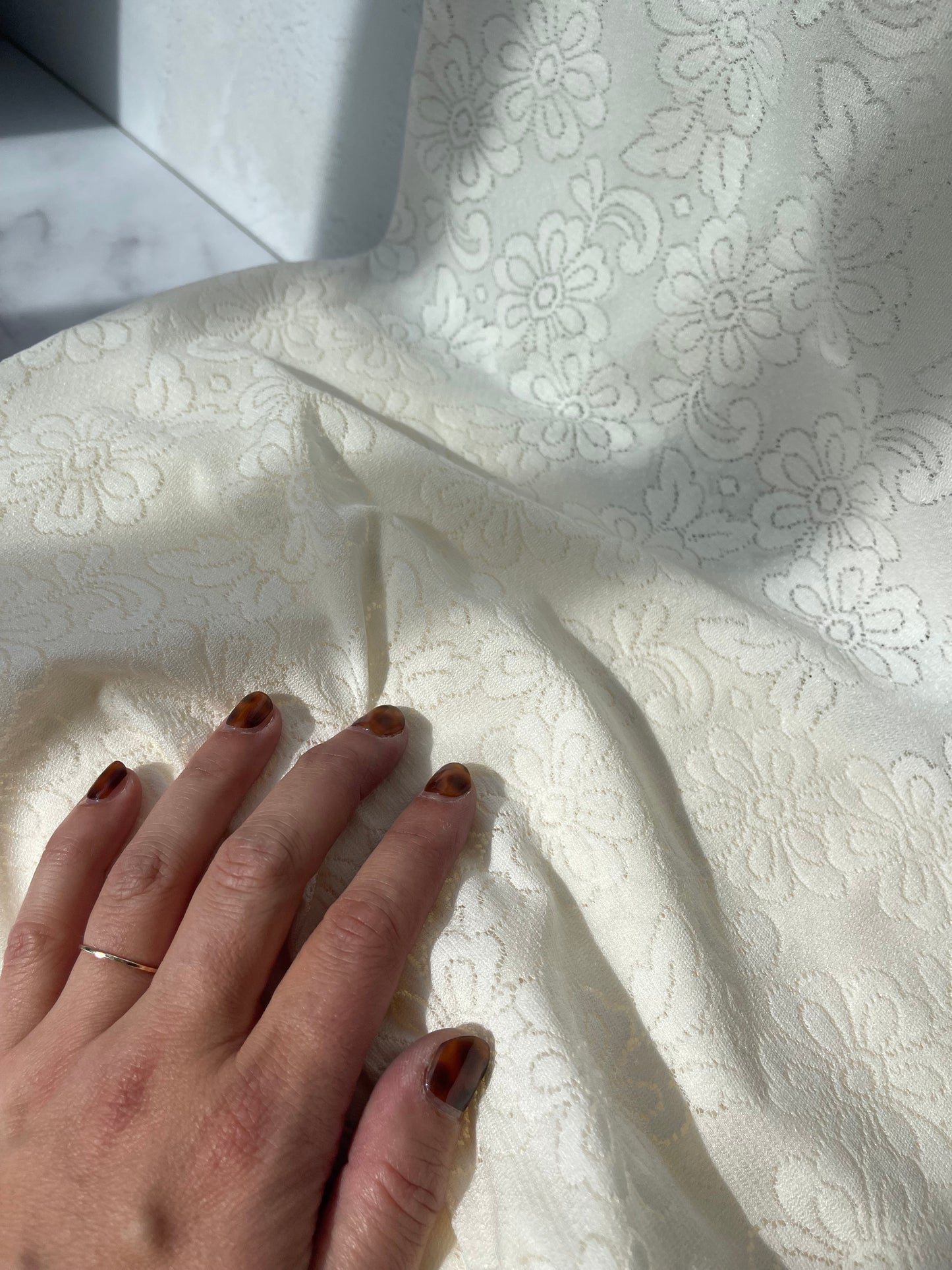 Vintage flowers Gebroken wit - Deadstock. Een zachte en soepele deadstock stof. De kleur is gebroken wit, zo'n typische vintage kleur. Er zijn bloemen in de stof geweven en de stof is semi transparant.
