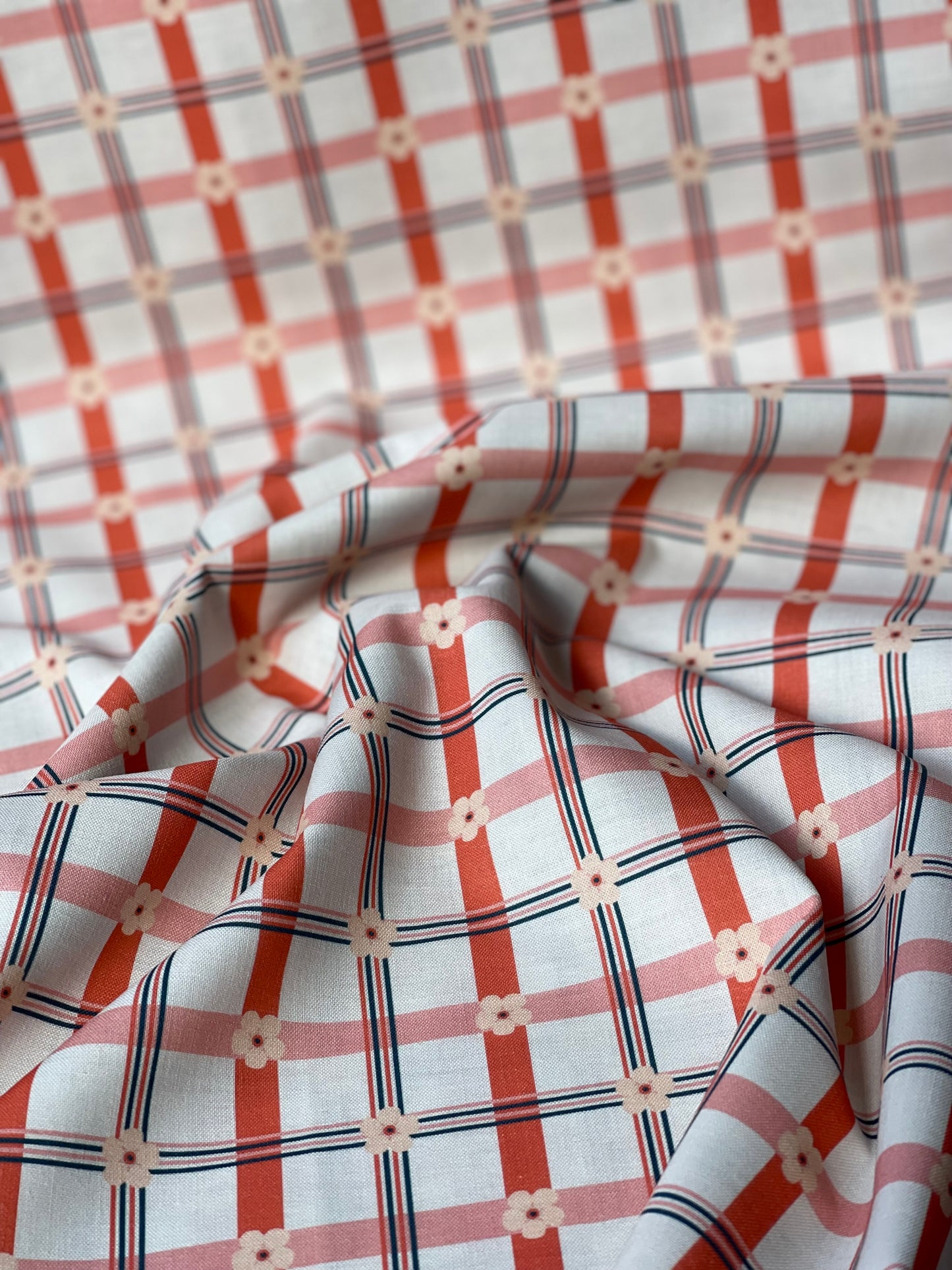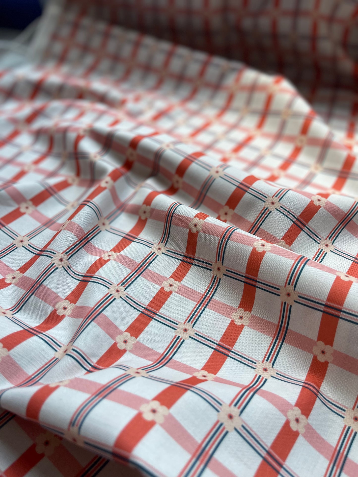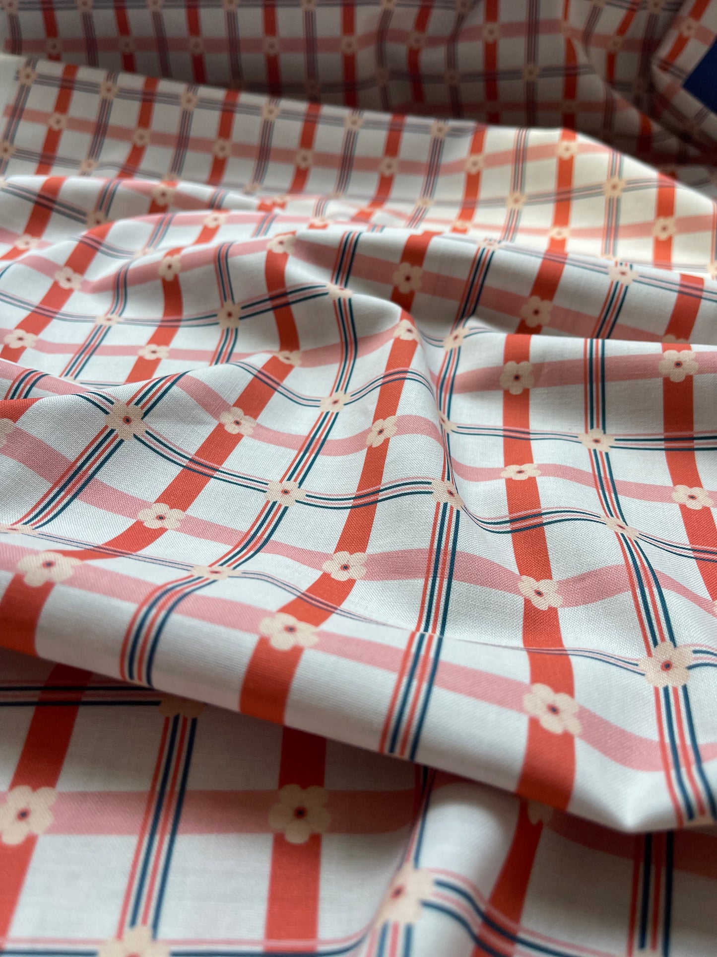 Een fijne katoenen stof met een ruitje en bloemetje.