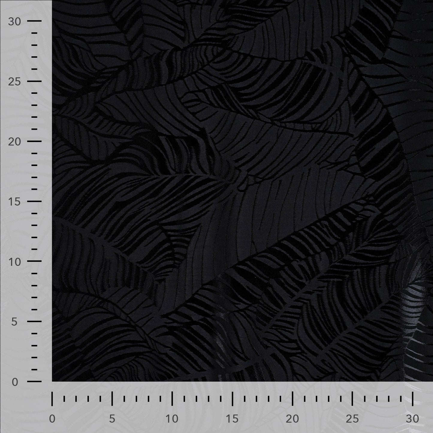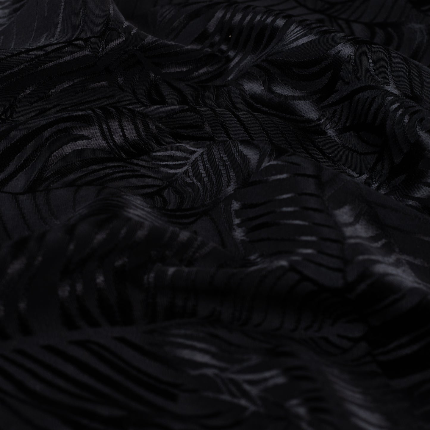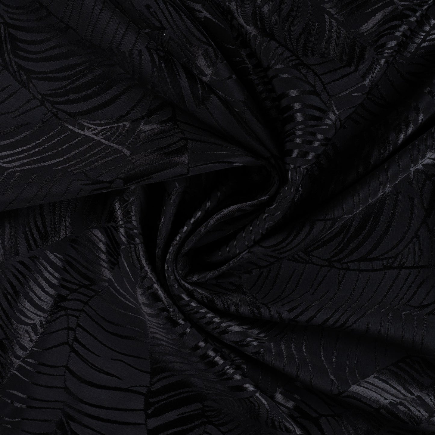 Leaves Zwart - Viscose. Deze stof heeft een matte ondergrond met glimmende contouren van bladeren die erin geweven zijn. De stof is soepel, valt goed door en is niet doorschijnend.