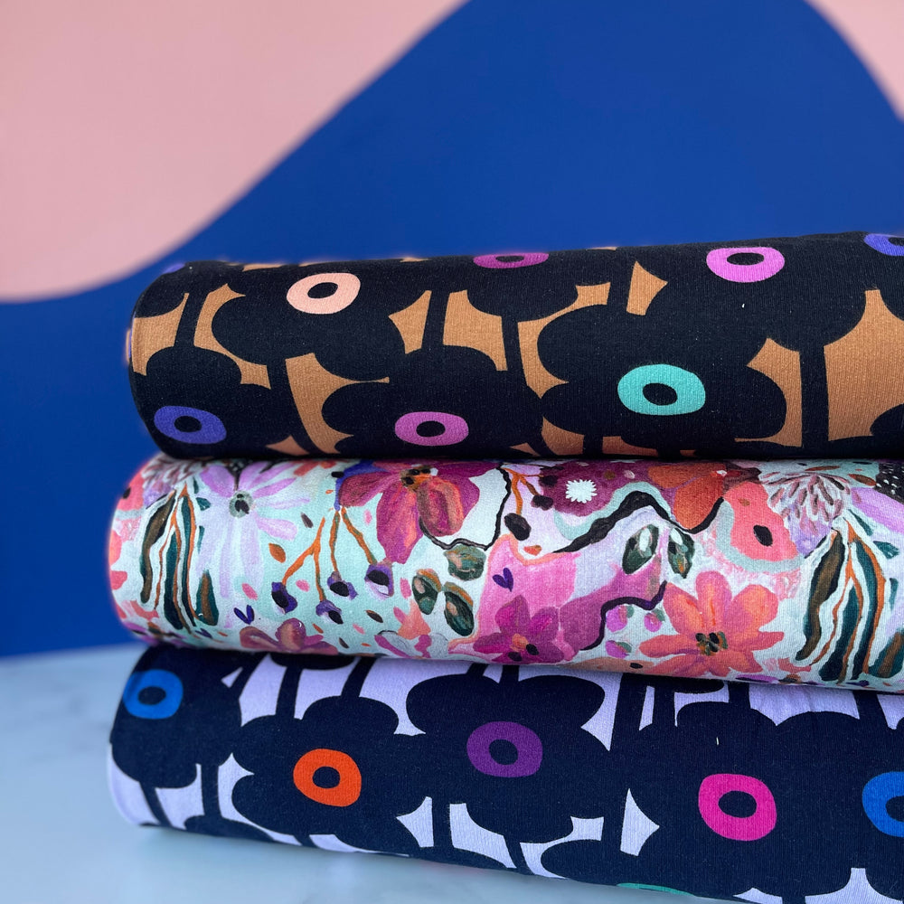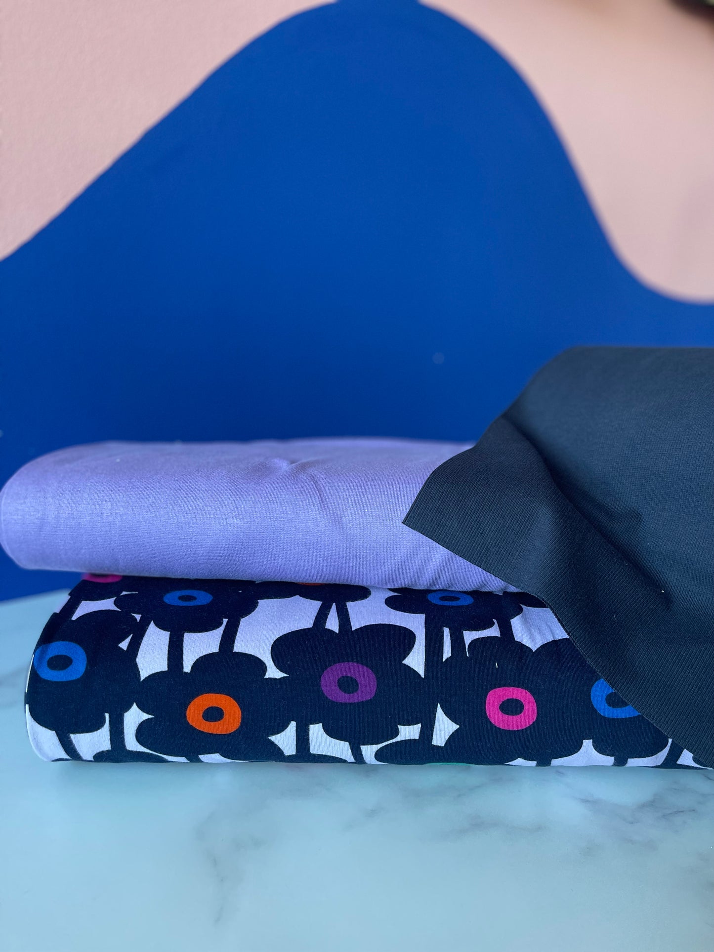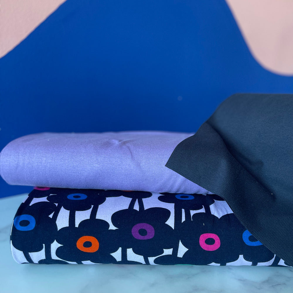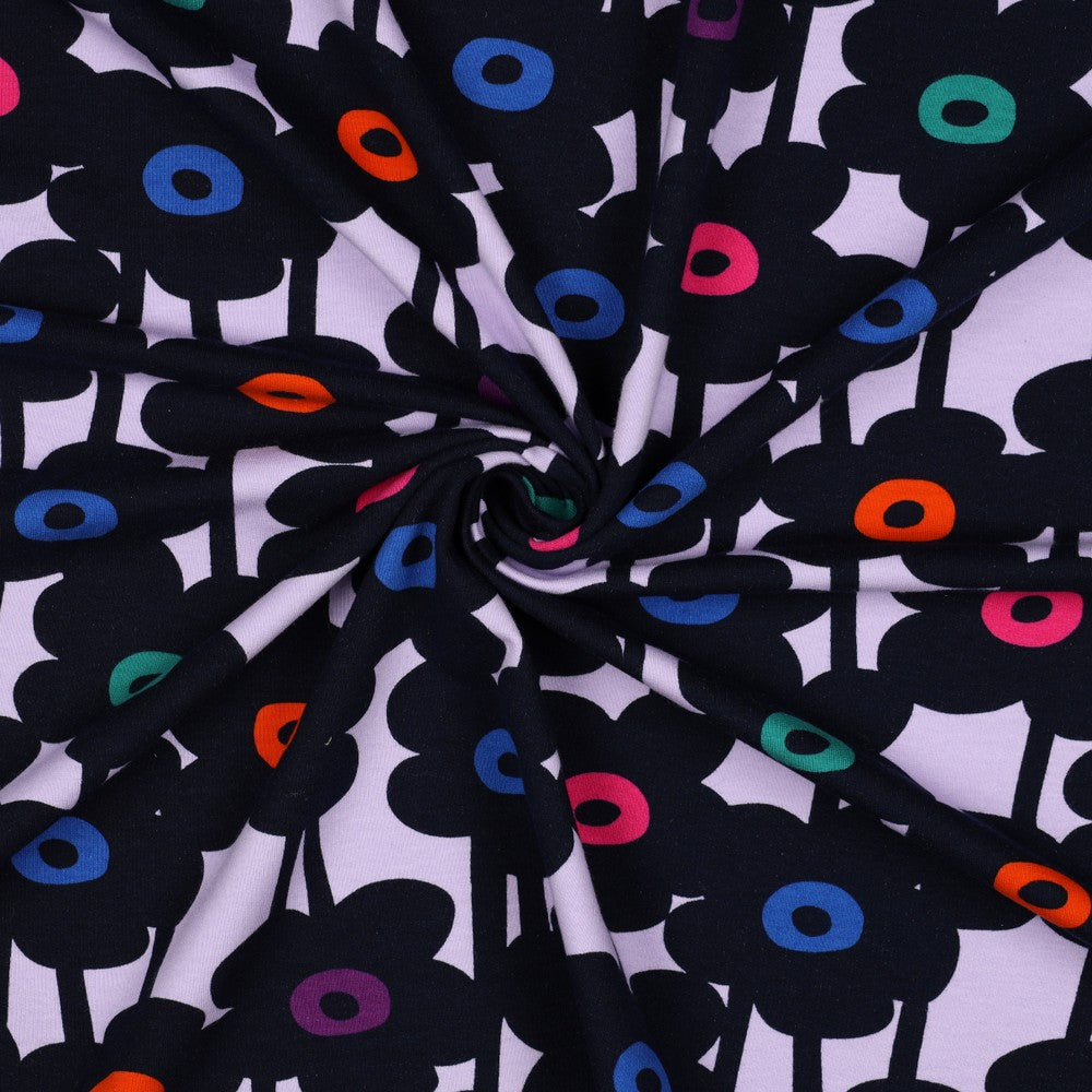 Soft Sweat Daisychain - Lavender - Nerida Hansen. De bloemen op deze stof zijn heel donkerblauw
