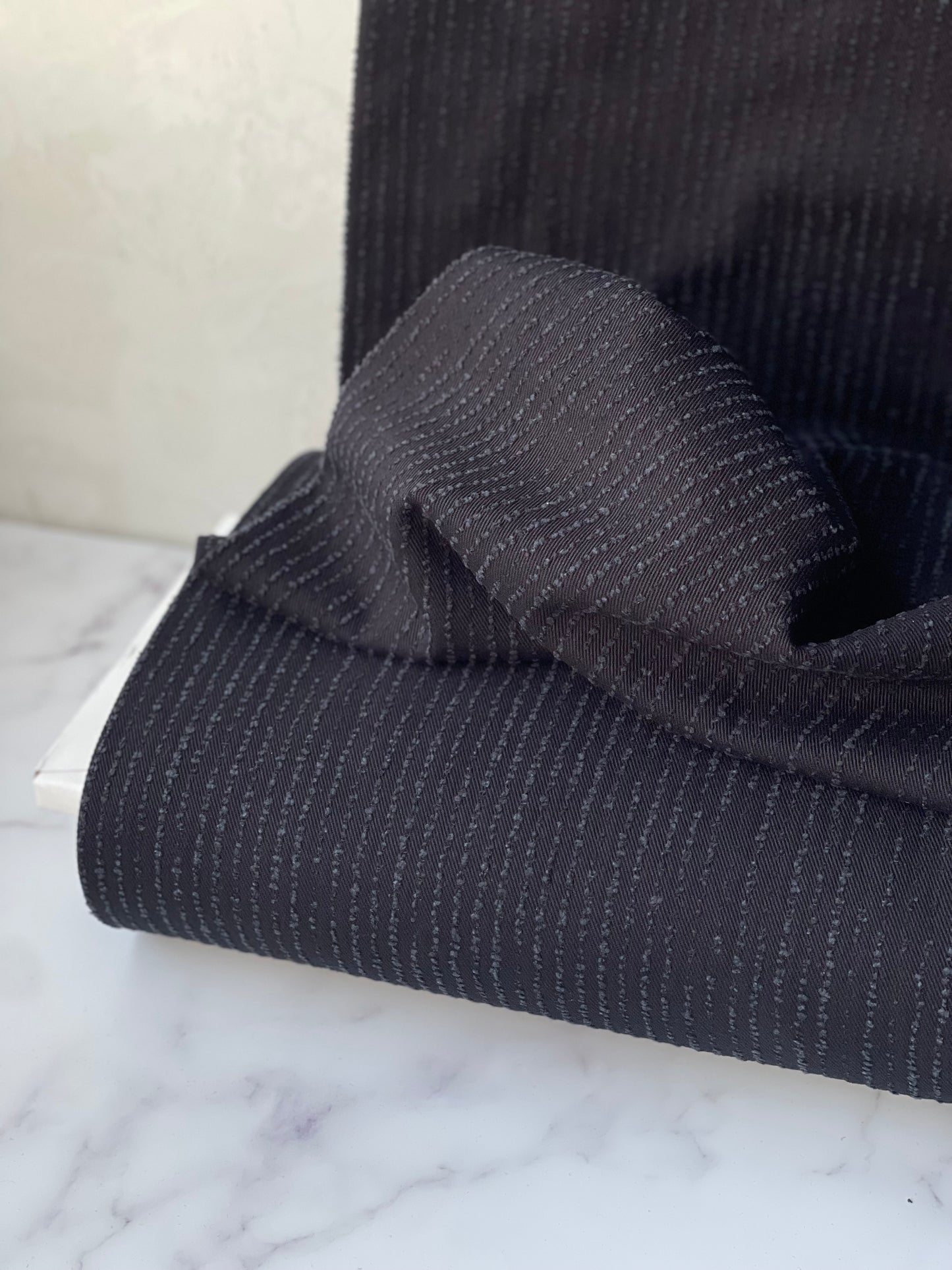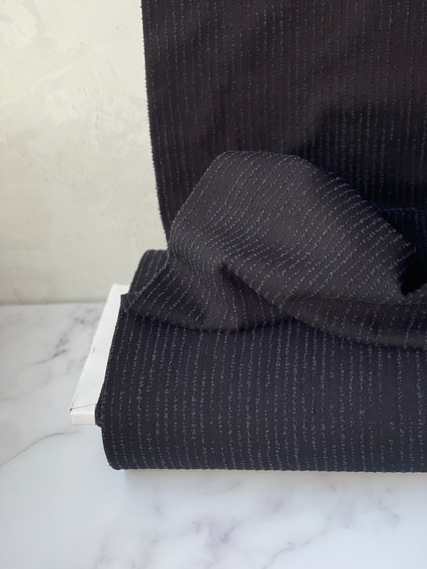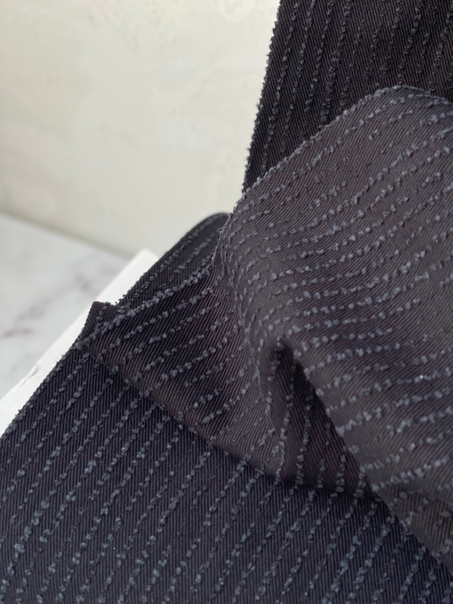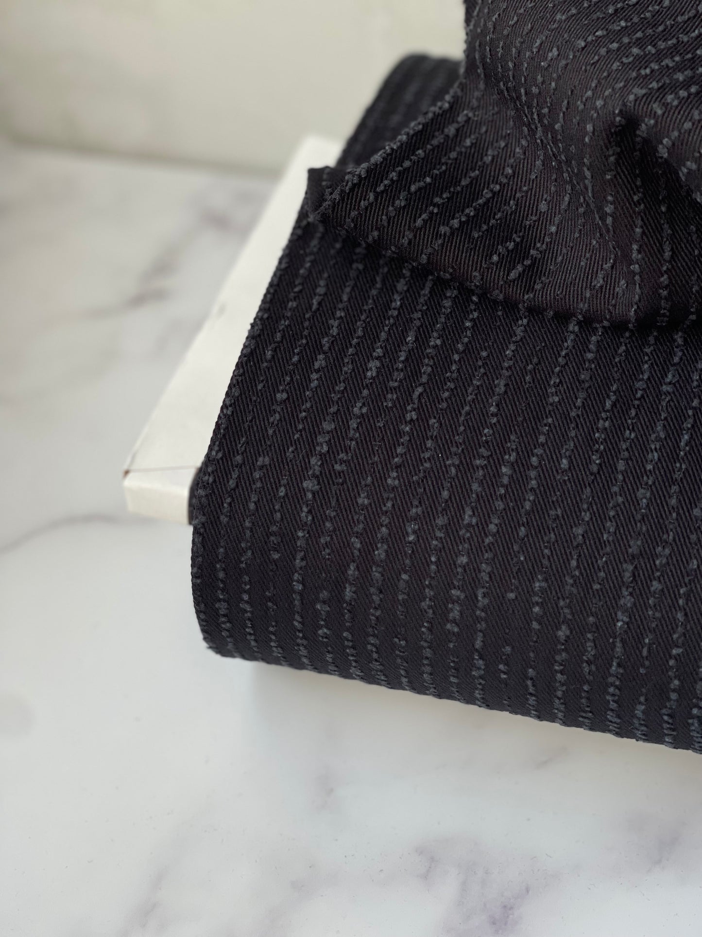 Cotton twill Jacquard - Zwart. Een dunnere denim met een onregelmatig stipjes/streepjes patroon erin geweven.