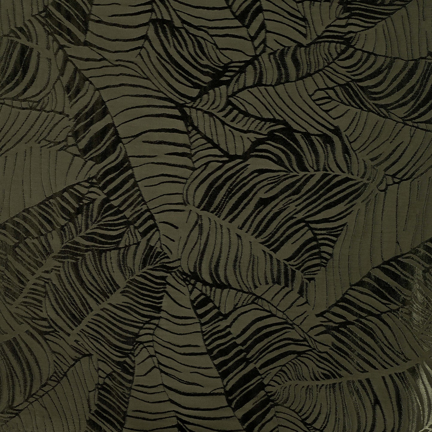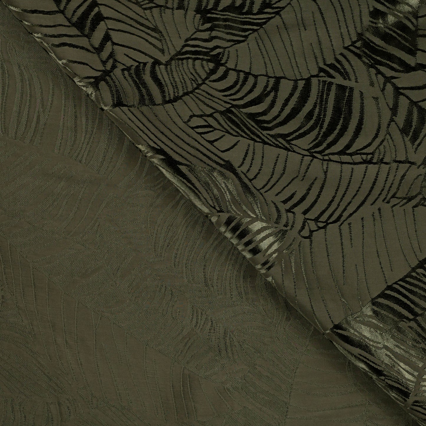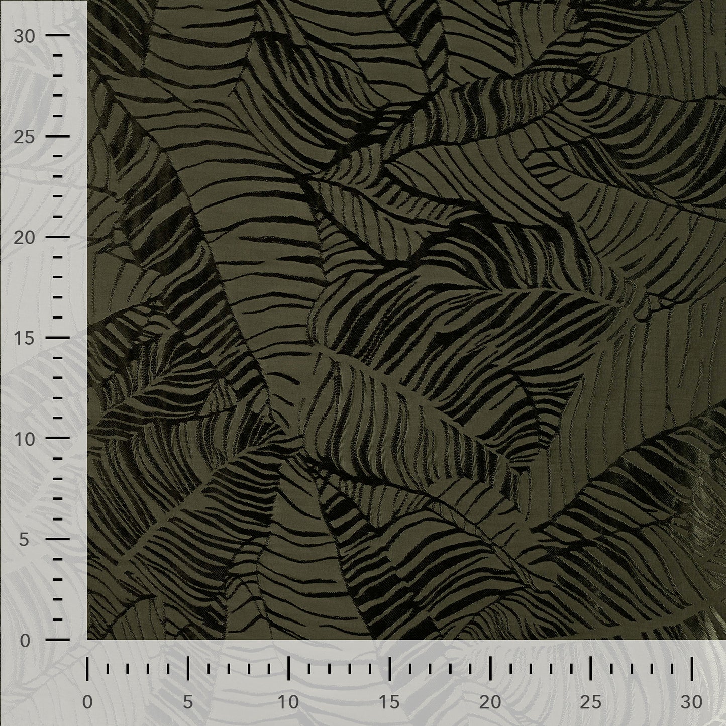 Leaves Olijfgroen - Viscose. Deze stof heeft een matte ondergrond met glimmende contouren van bladeren die erin geweven zijn. De stof is soepel, valt goed door en is niet doorschijnend.