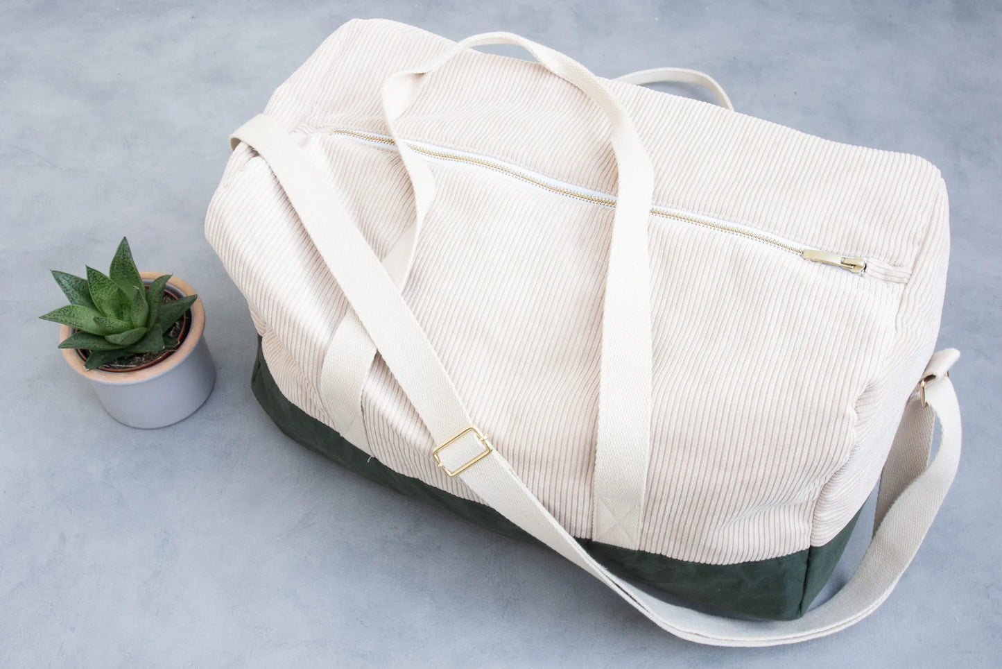 De sporttas heeft handvatten en een schouderriem en een binnenzakje dat sluit met drukknoopje of magneetje. Je kan hem uit één stuk maken of uit twee stukken met een bodem in een andere stof of kleur.