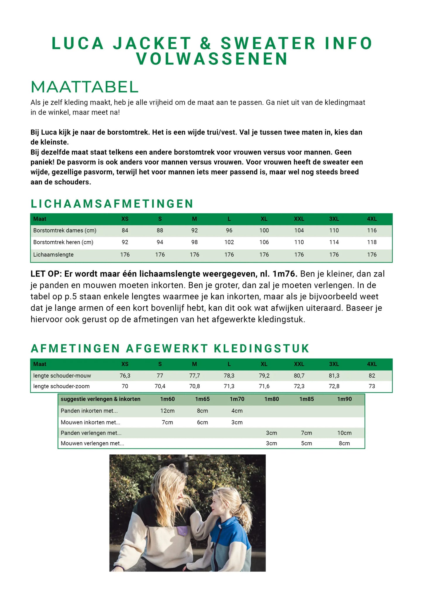 Luca is een patroon voor een unisex sweater of jacket met afhangende mouwen en een kraag. De zoom en mouwen worden afgewerkt met (rekbare) biais. Ook de voorkant naast de rits en de kraag worden afgewerkt met biais. Kies voor het jacket dat helemaal opengaat tot beneden of naai een trui waarbij de rits half opengaat. Luca leent zich perfect tot color blocking met de naad op het achterpand, voorpand en de mouw. Tussen de naad op het voorpand zit een zakflapje. De rits heeft een ritsbeleg dat tijdens het dragen achter de rits zit.