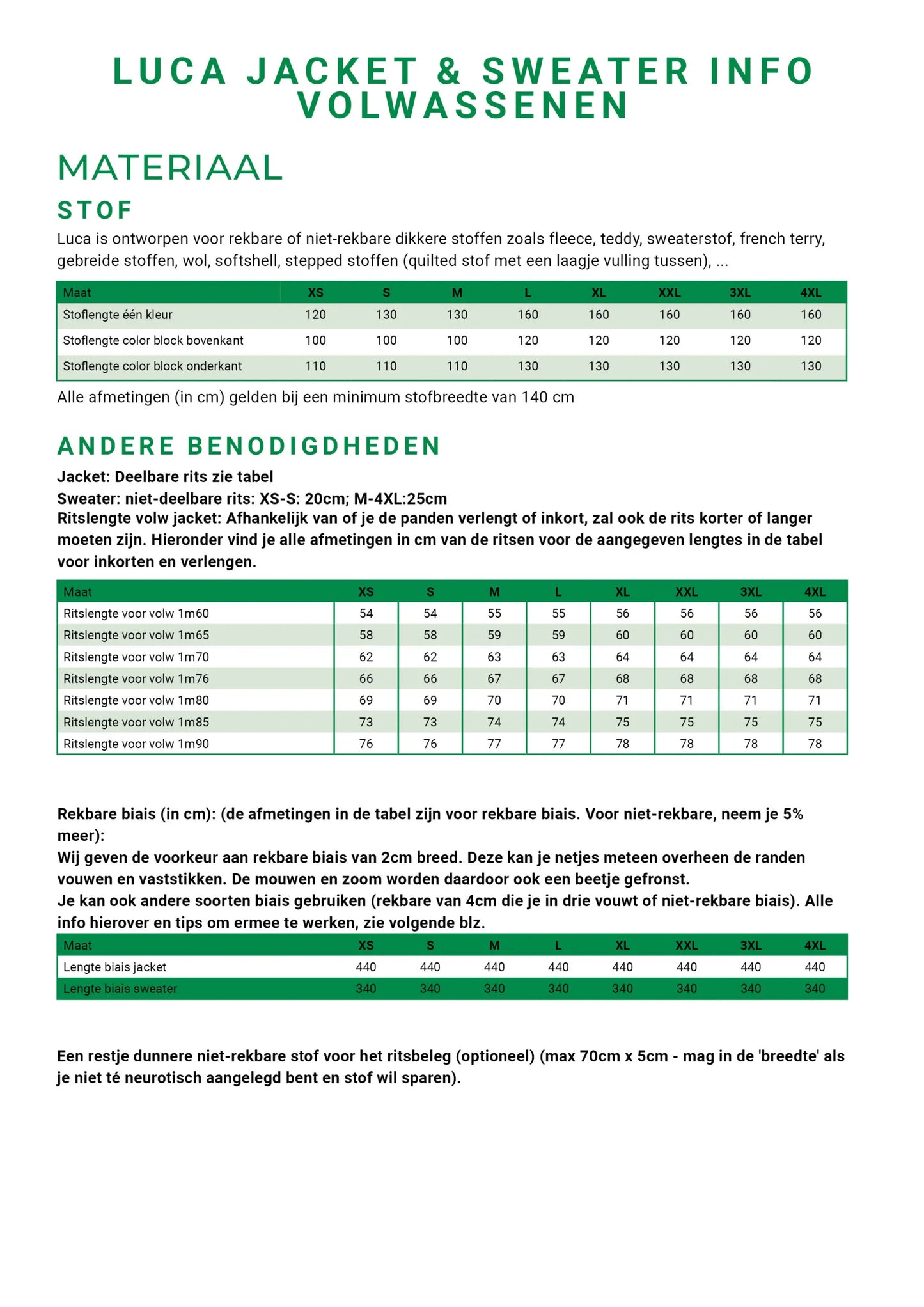 Stofkeuze: Luca is ontworpen voor rekbare of niet-rekbare dikkere stoffen zoals fleece, teddy, sweaterstof, french terry, gebreide stoffen, wol, softshell, stepped stoffen (quilted stof met een laagje vulling tussen), …
