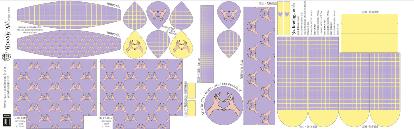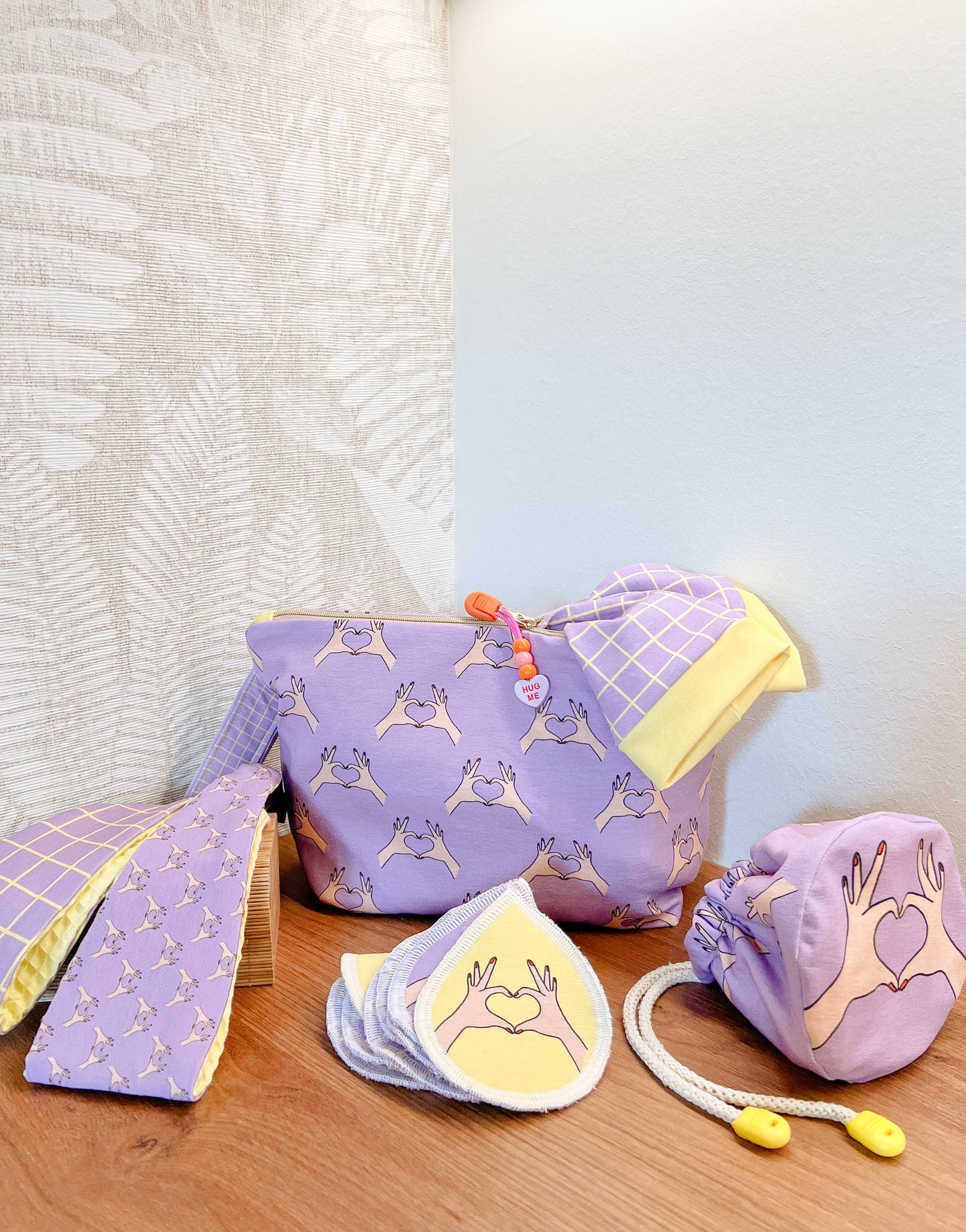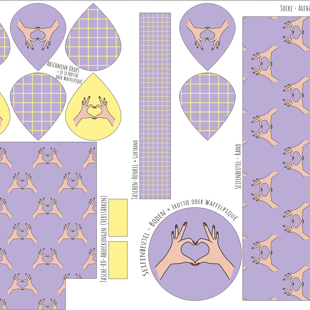 Regular price €4,95Beauty Kit Paneel - Jersey - Love Hands. Met dit paneel maak je: 1 toilettas (rits niet inbegrepen), 8 herbruikbare make-up pads, 1 haarband, 1 zeep zakje, 1 paar sokken. Dit product bevat enkel het paneel. Je hebt zelf nog een rits, versteviging en een voeringsstof nodig.