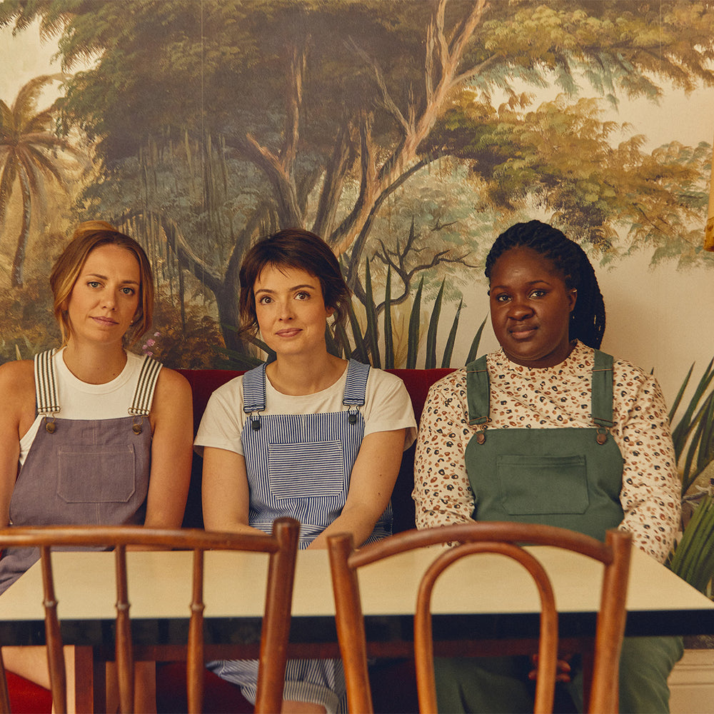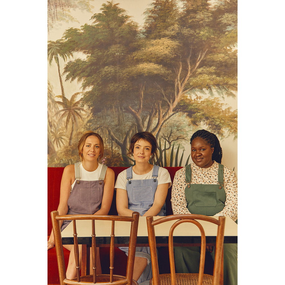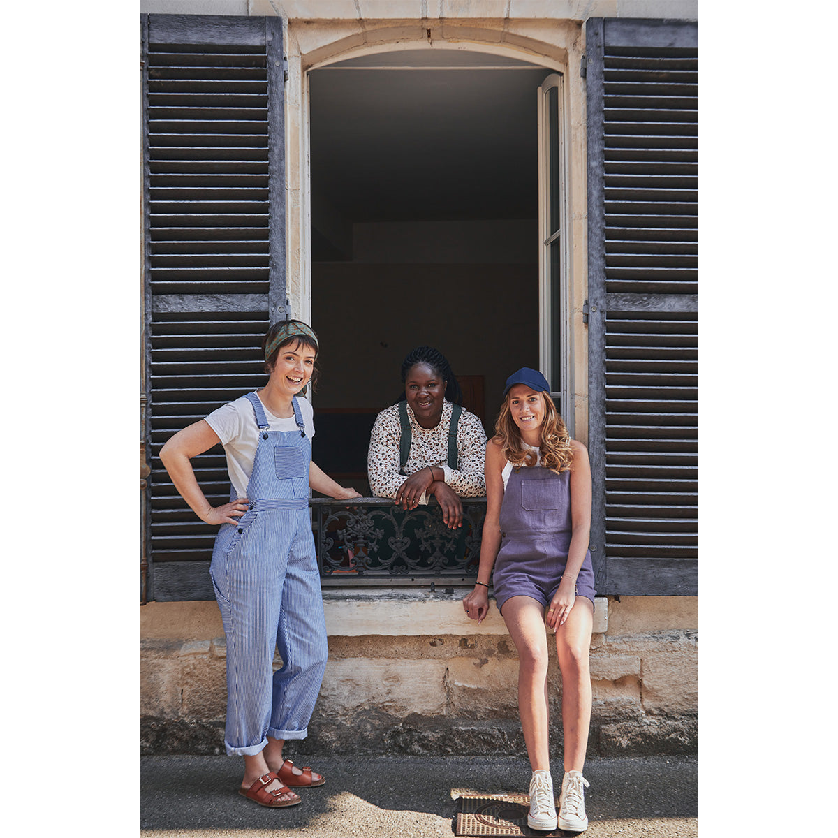 Oumou wears Cedar gabardine dungarees in size 48. ChloƩ wears Prune linen dungarees in size 36. Charlotte wears long denim dungarees in size 36. NoƩmie wears striped dungarees in size 40.