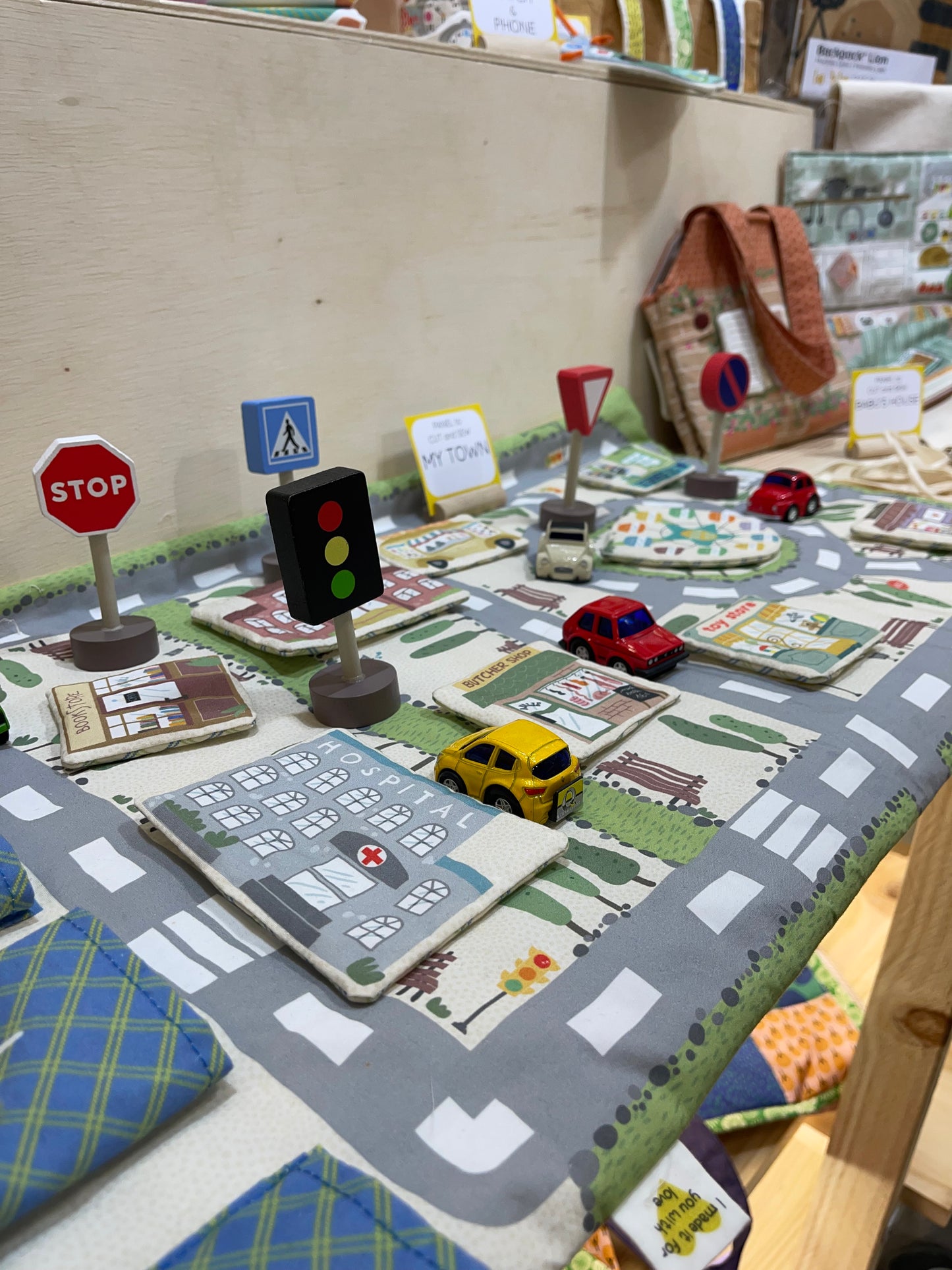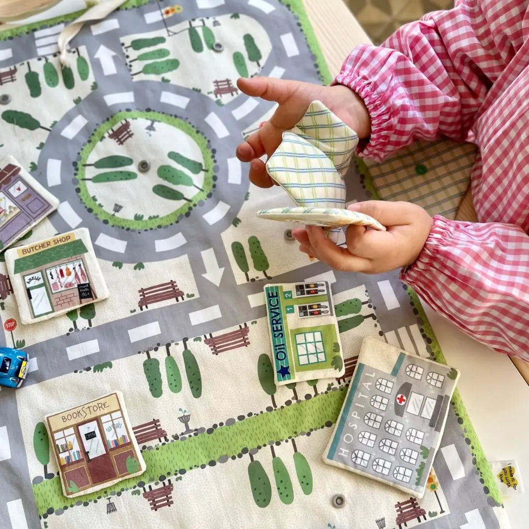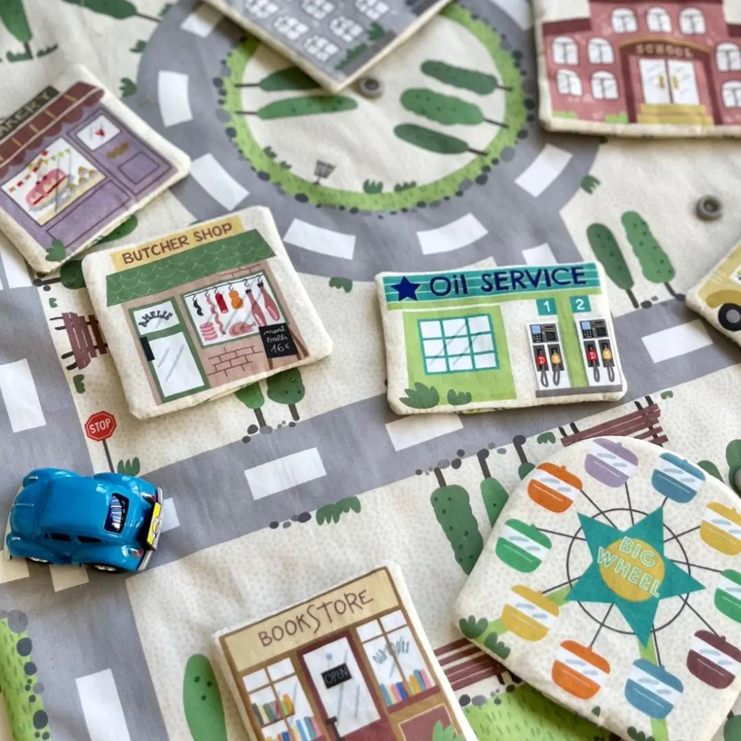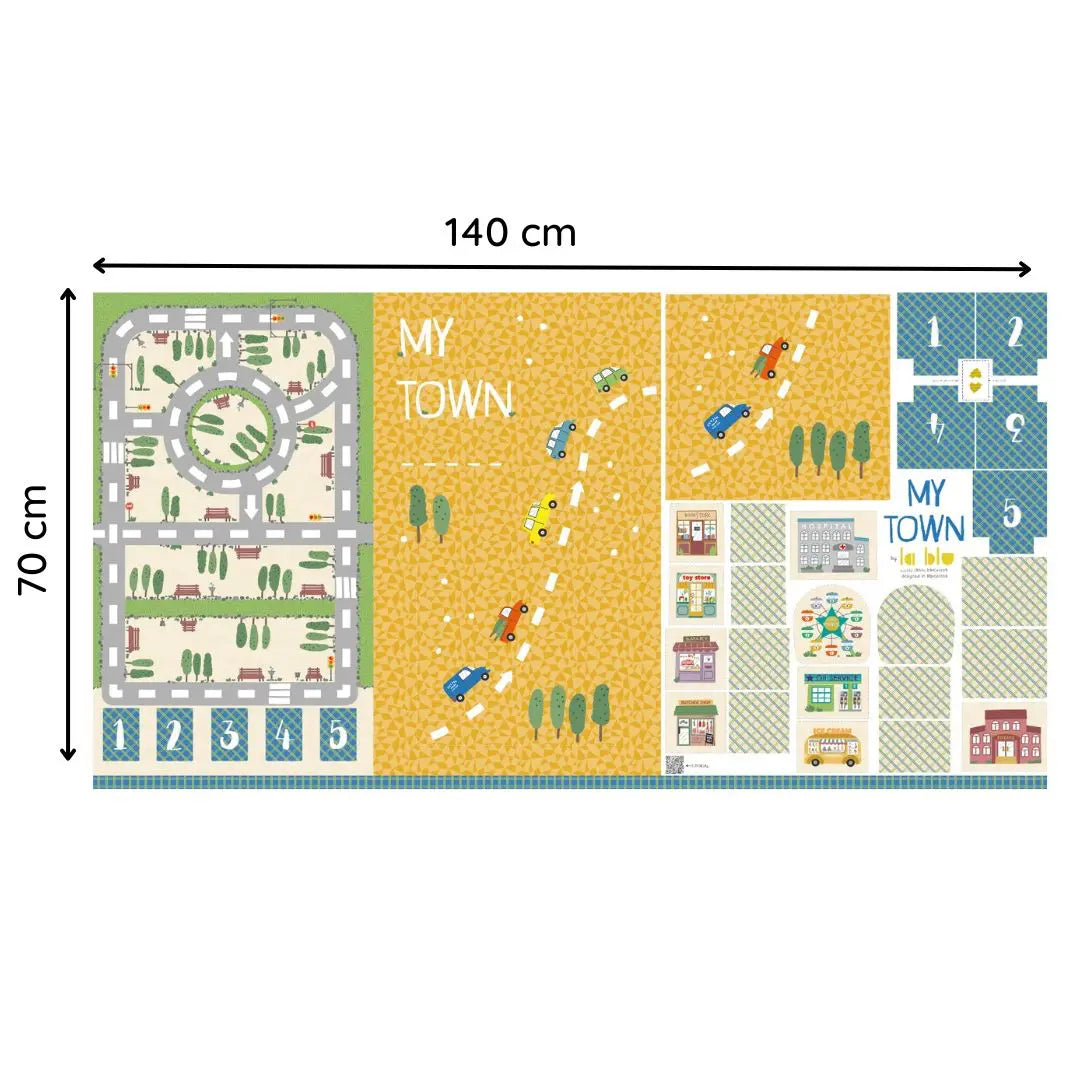 With the My Town board, you can make a play mat that resembles a small town with its buildings, movable shops, and 5 parking spaces to play with your favorite cars. It's a fun and educational game. And when the game is over, the board can be hung up to add a decorative touch to your child's room, or it can be rolled up to store or take with you wherever you go.