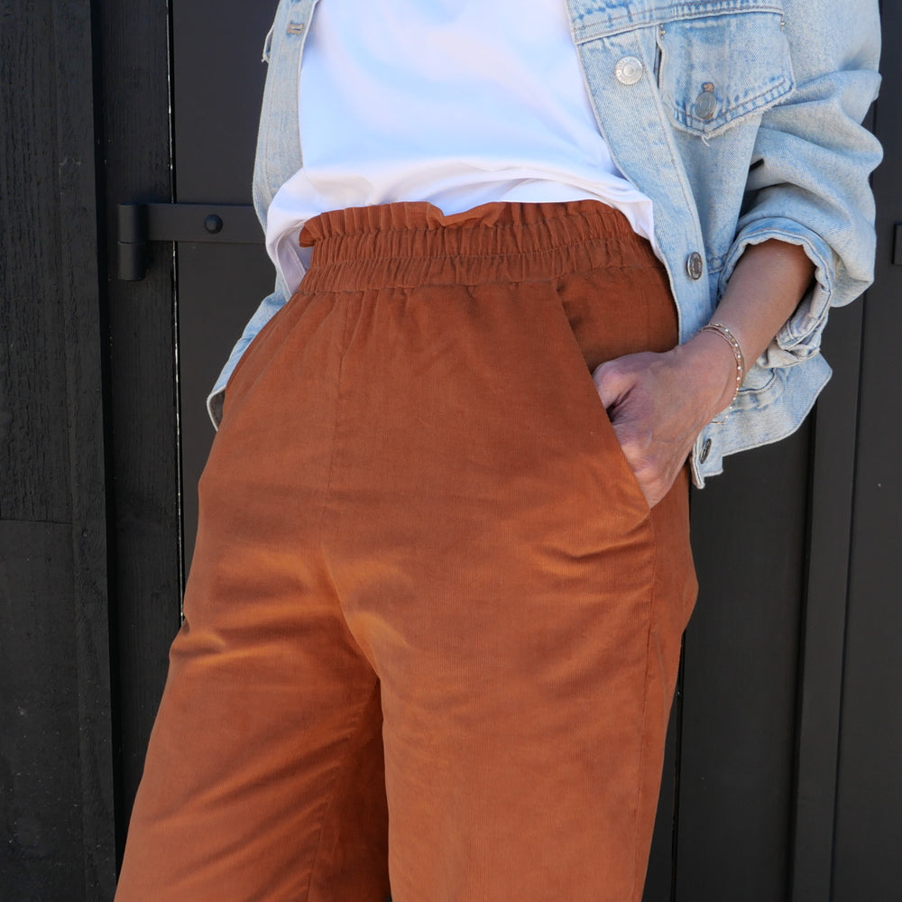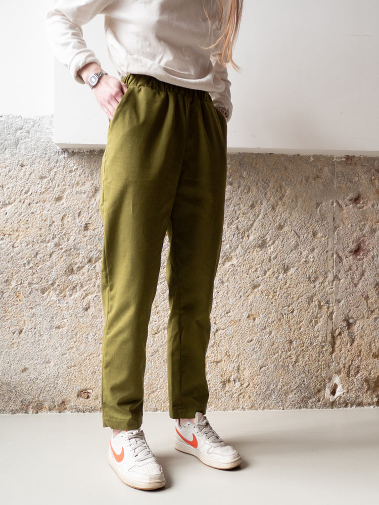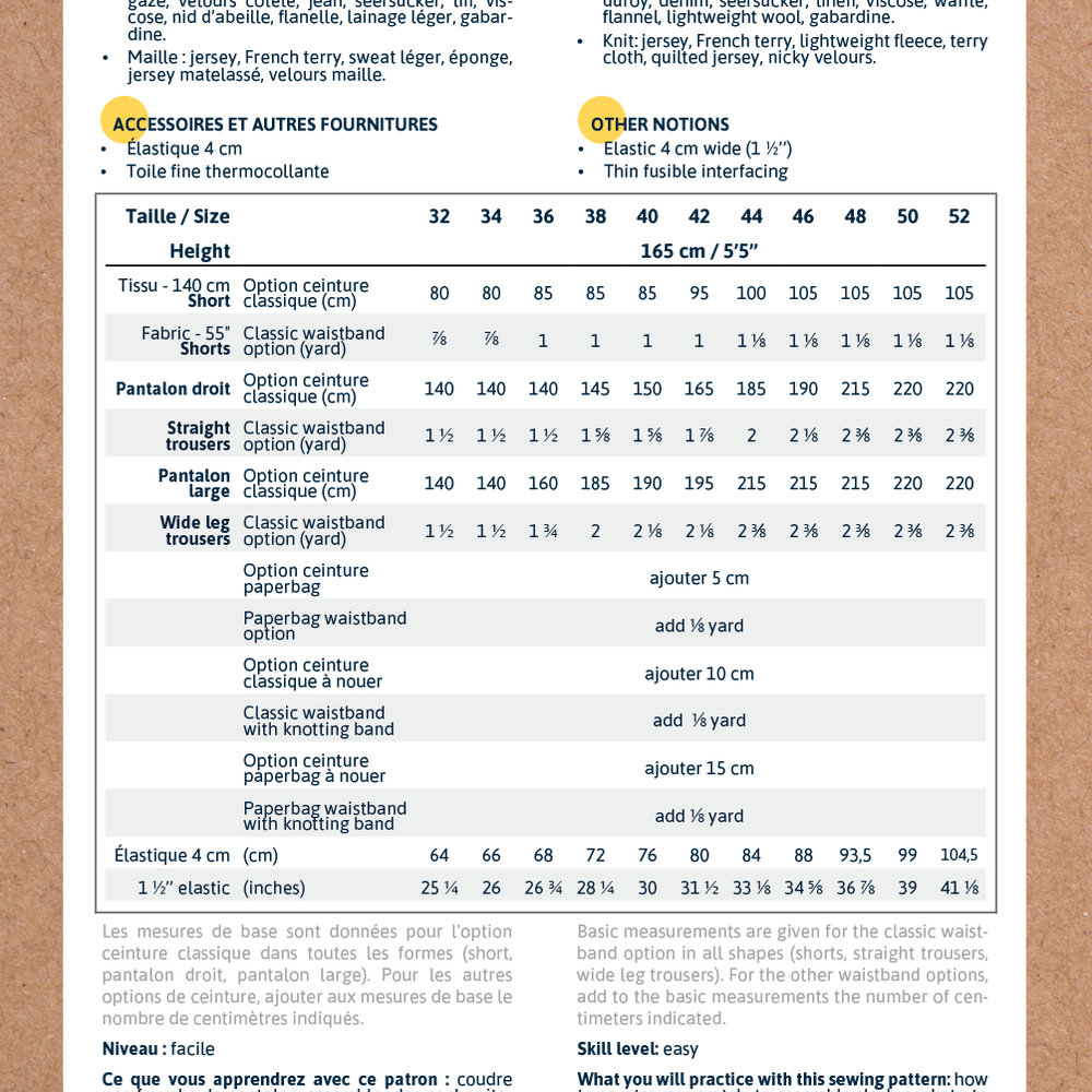What you will learn with this sewing pattern:Ā how to sew trouser crotch, to assemble slash pockets, to elasticate a waistband.